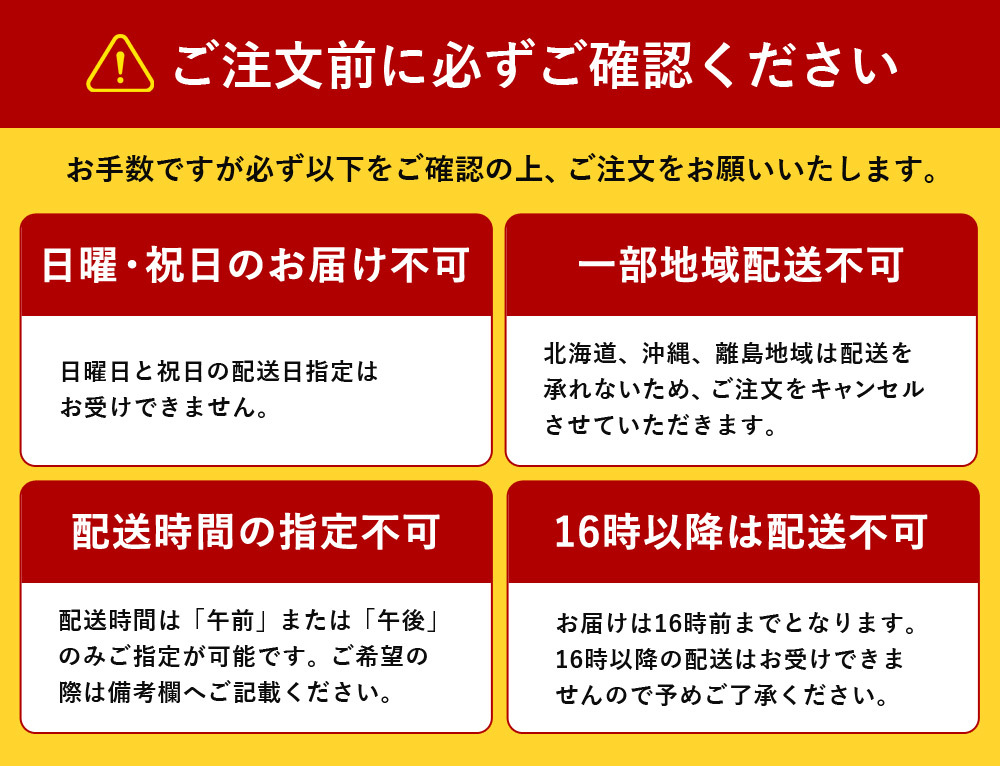 配送時間帯につきましても、平日 AM/PM(16時以降配送不可)のみ受付となりますので、予めご了承ください。