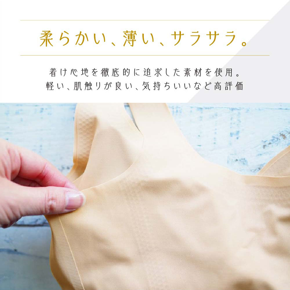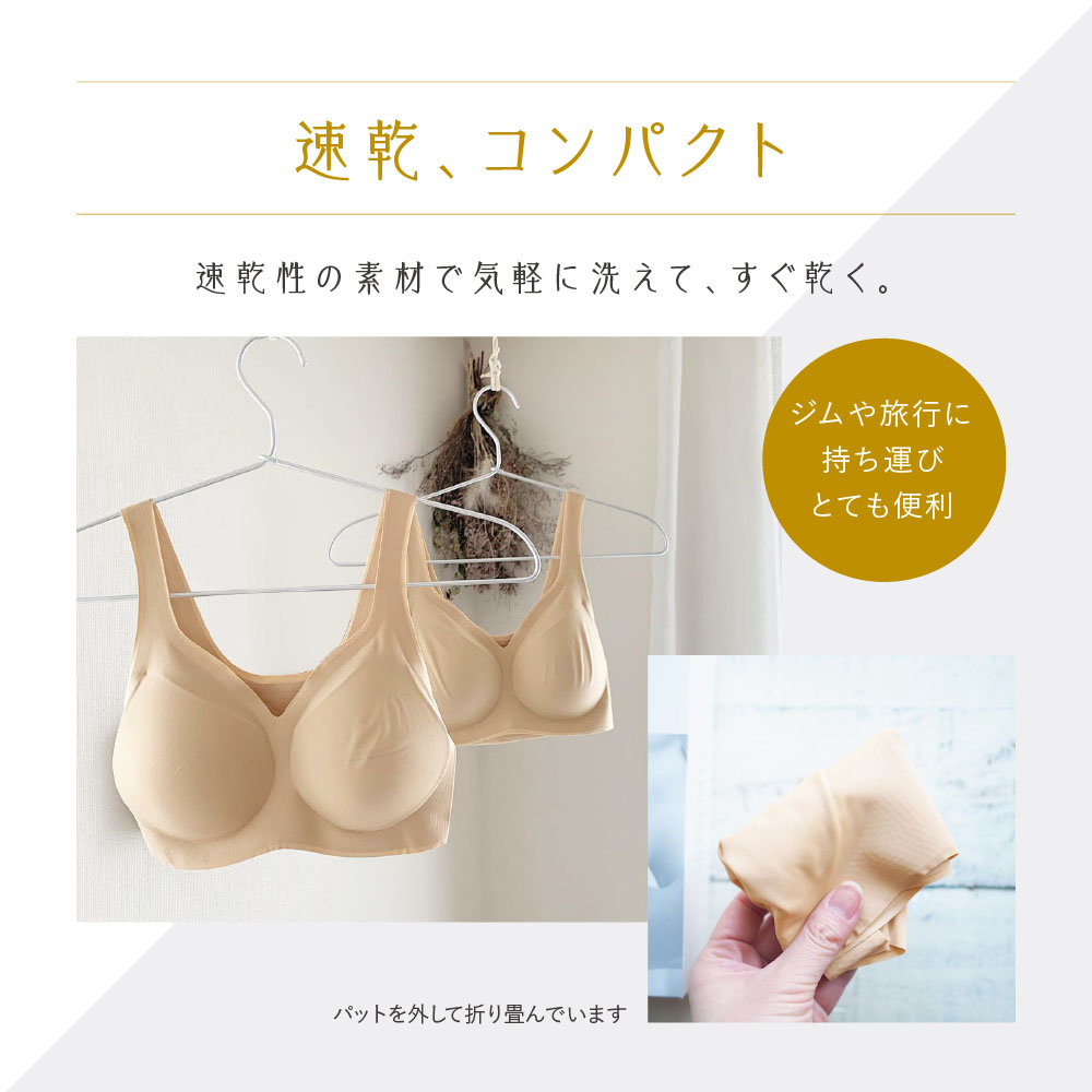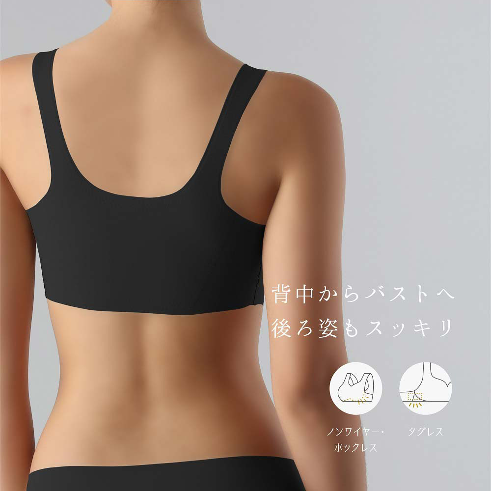 ワイヤーが無いから痛くなりにくい。ホックが無いから違和感も感じにくい。快適なフィーリングとホールド感をノンワイヤーで実現。ワイヤレスブラの新しい着ごこちです。