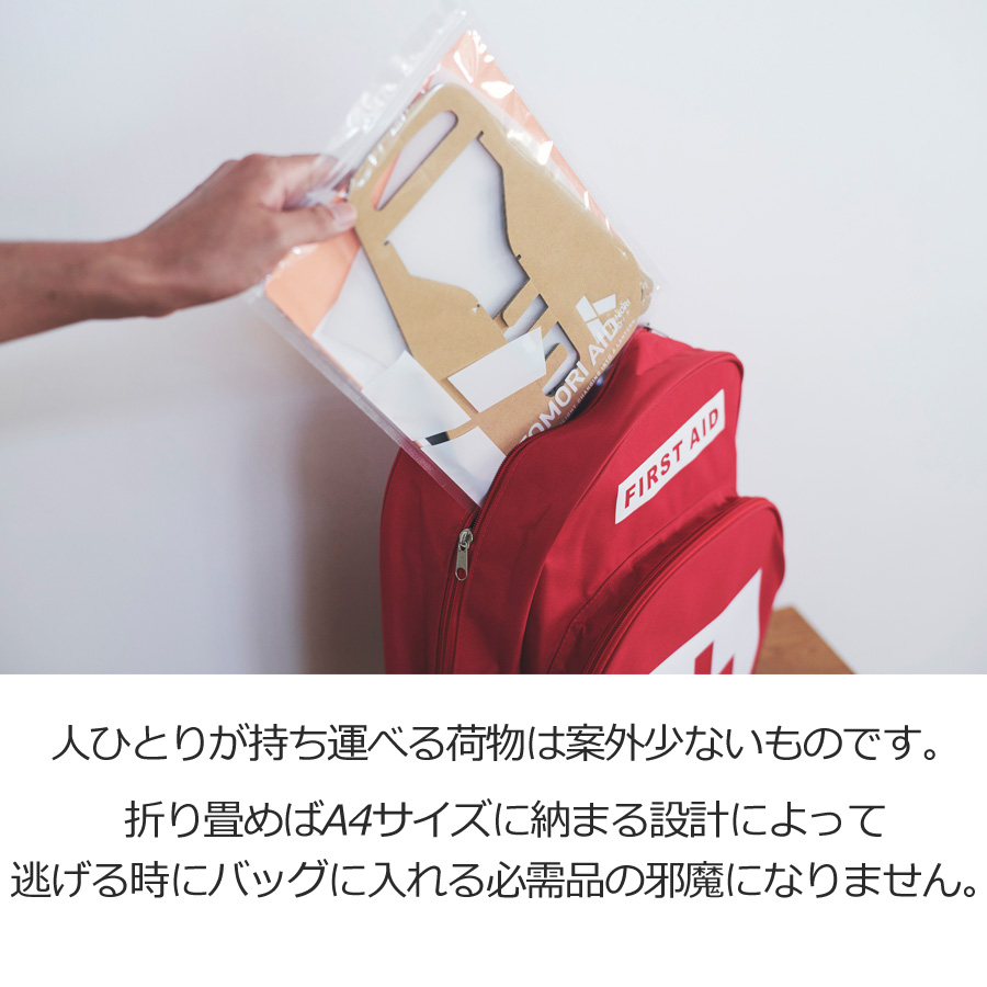 人ひとりが持ち運べる荷物は案外少ないものです。逃げる時の荷物は水や食料など命に関わる物資を優先する必要があり、重くかさばるランタン製品などは到底持っていけません。折り畳めばA4サイズに納まる設計によって逃げる時にバッグに入れる必需品の邪魔になりません。