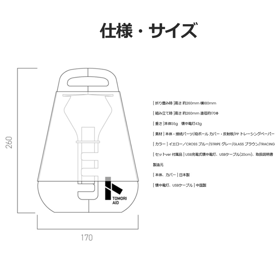 シンプルな構造と固定方法によって簡単に組み立てられ、サイズの合う懐中電灯であれば何でもランタンに変えられます。USB充電式LED懐中電灯がセットになっているのですぐにご使用頂けます。充電しながらの使用も可能です。