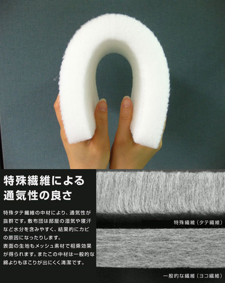中材には従来の布団によく使われる横型成型繊維ではなく、縦成型繊維を使用。