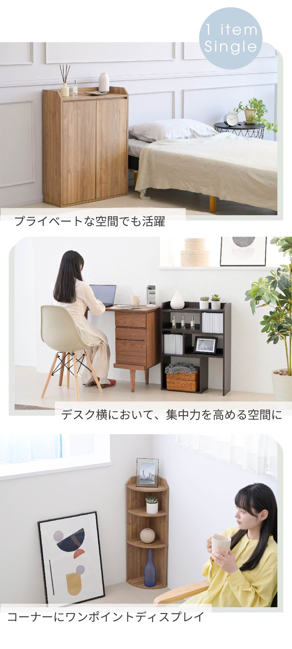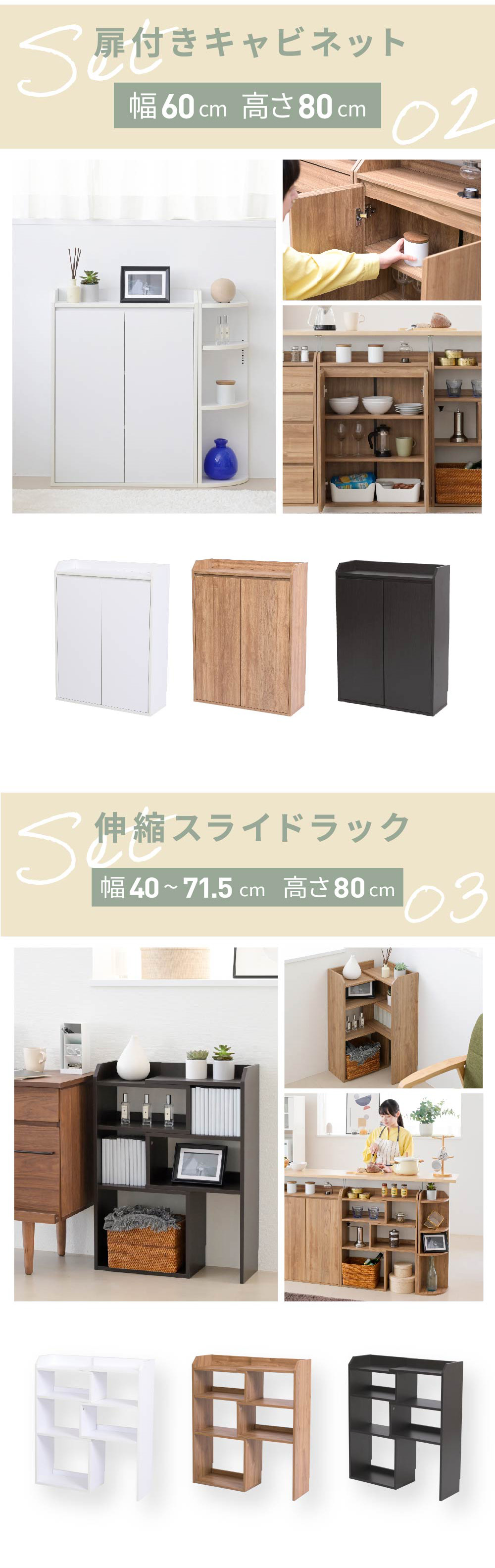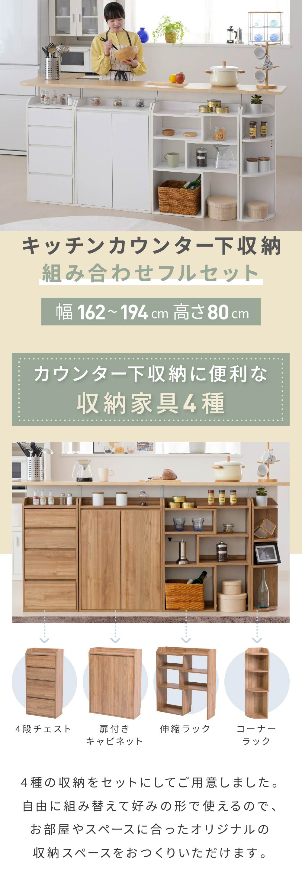 カウンター下やリビングの窓下など、部屋のデッドスペースを有効利用できる家具シリーズ。コーナーラック+伸縮ラック+扉付き収納+チェストのフルセット