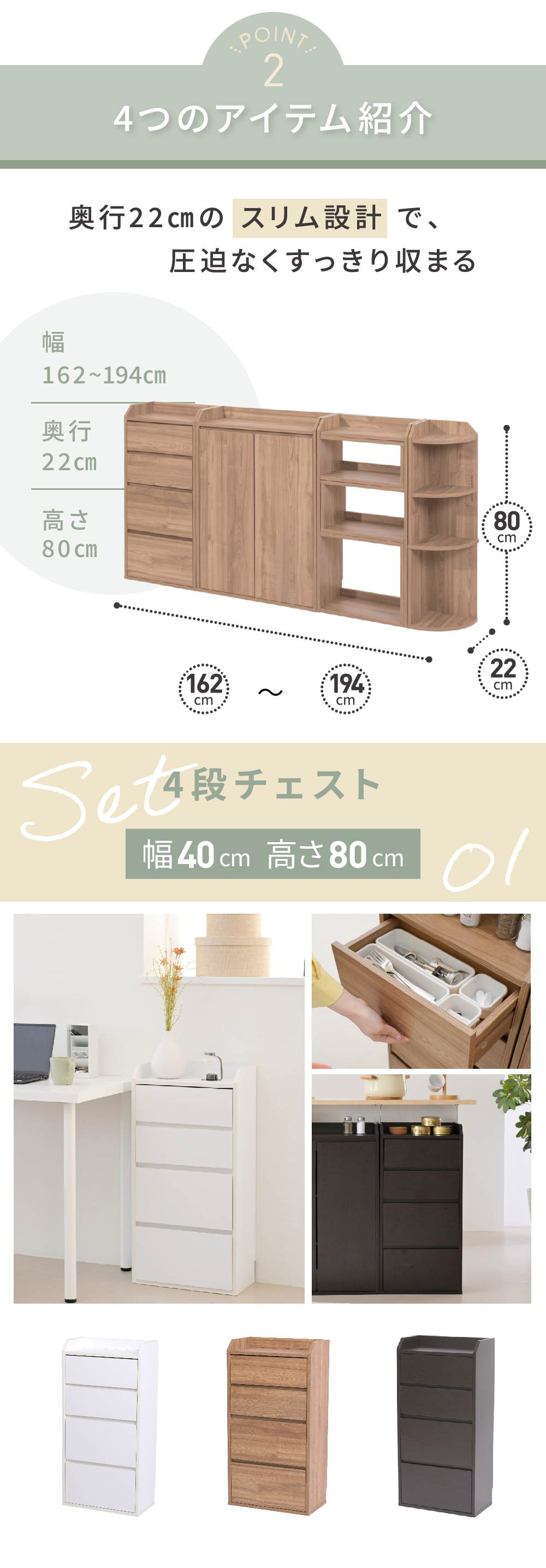 カウンター下収納 薄型 ミニ キャビネット ミニ チェスト 4点 セット 幅162 ~ 194 奥行22 高さ80 伸縮ラック コーナー ラック 突っ張り 組み合わせ 木製[ブラウン]