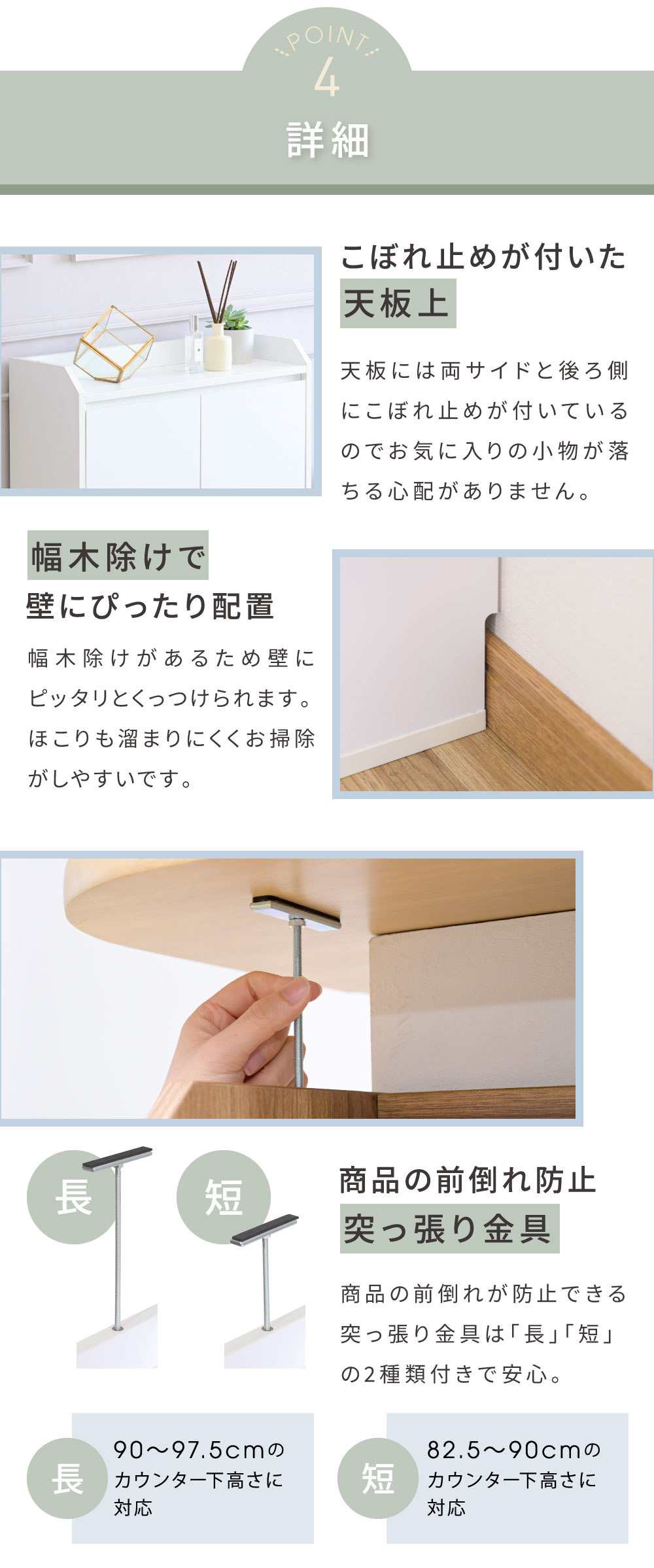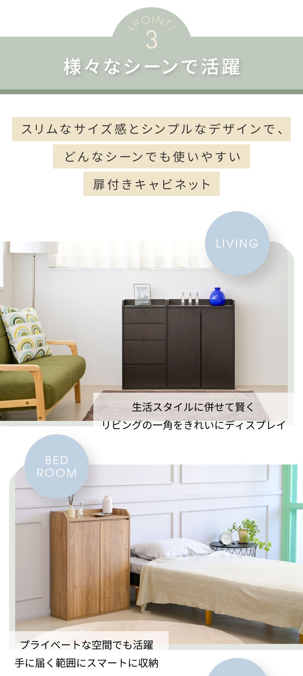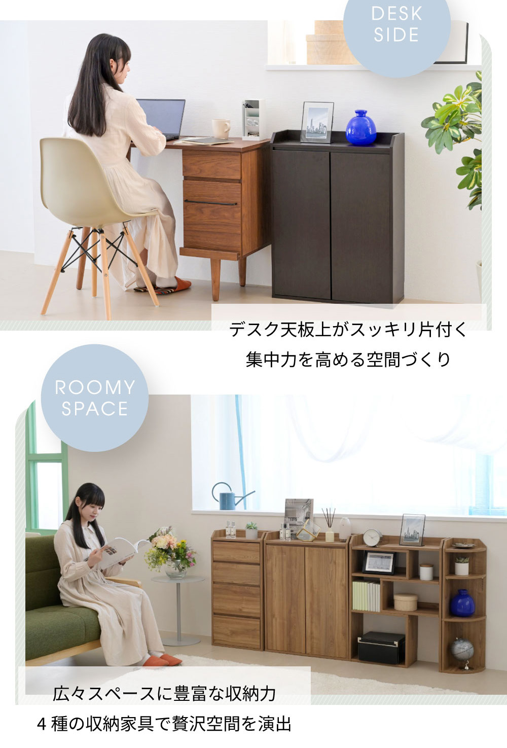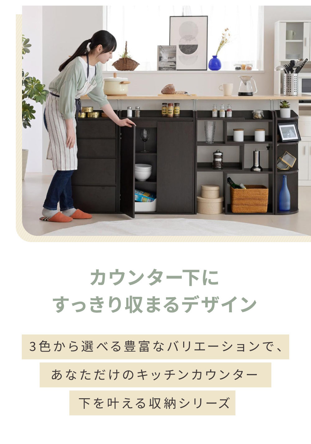 カウンター下やリビングの窓下など、部屋のデッドスペースを有効利用できる家具シリーズ。収納場所に困る小物や雑貨のちょっとした収納が可能な扉付き収納