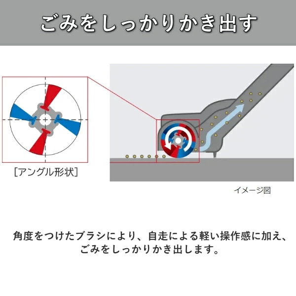 ◎ごみをしっかりかき出す 角度をつけたブラシにより、自走による軽い操作感に加え、