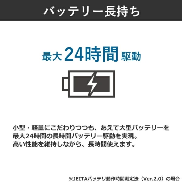 大型バッテリーを搭載しており、最大24時間の長時間駆動※を実現。