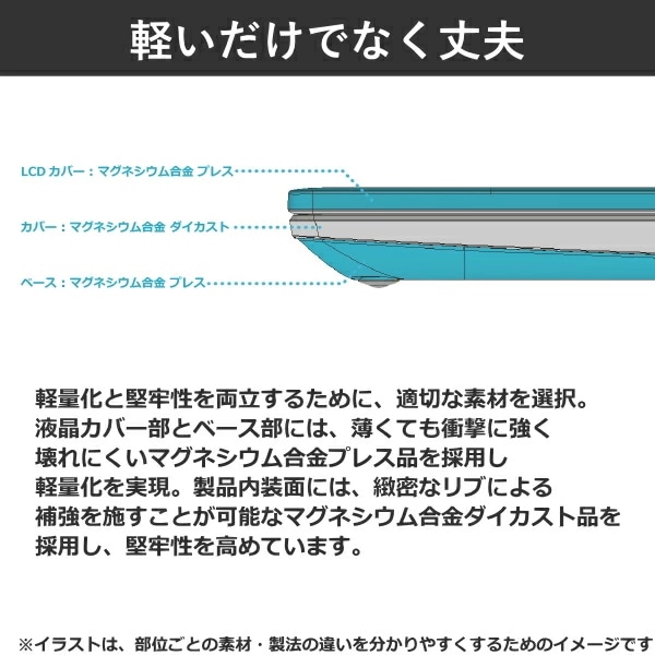 ◎軽量化と堅牢性を両立 液晶カバー部とベース部には、薄くても衝撃に強く壊れにくい