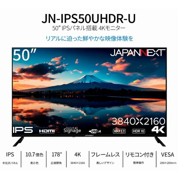 50インチ 4K 液晶モニター IPSパネル JAPANNEXT JN-IPS50UHDR-U フリッカー軽減 ブルーライト軽減 フレームレス ステレオスピーカー搭載 JN-IPS50UHDR 50型 リモコン付属 USBポート HDMI端子 デジタルサイネージ Ultra HD対応 PS4 PS5 任天堂Switch
