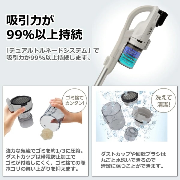 「デュアルトルネードシステム」で、吸引力が99%以上持続。