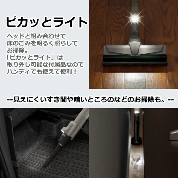 ◎ピカッとライト ヘッドと組み合わせて、床のごみを明るく照らしてお掃除。
