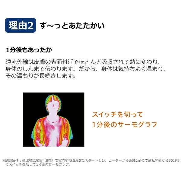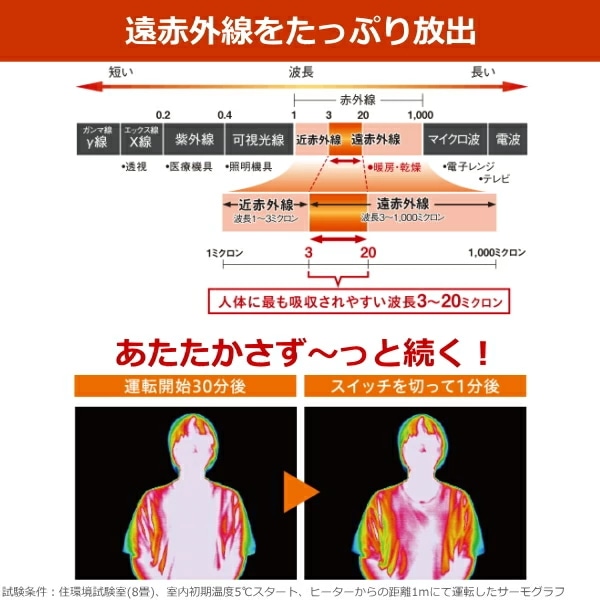 ◎ず~っとあたたかい 遠赤外線は皮膚の表面付近でほとんど吸収されて熱に変わり、