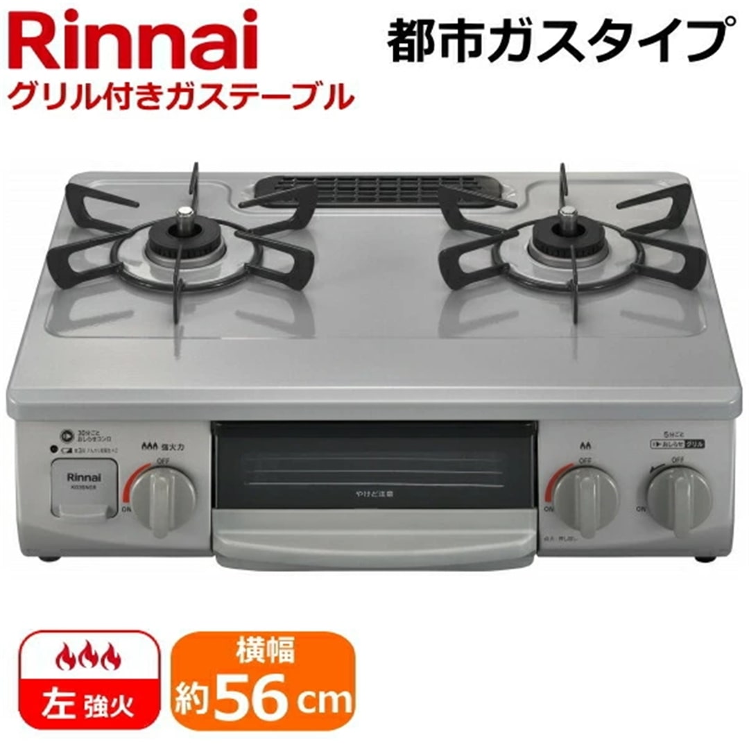 リンナイ 据え置き ガスコンロ テーブルコンロ KG35NGRL-13A 左強火力 水無片面焼きグリル 都市ガス グレー 幅56cm 二つ口 ガステーブル Rinnai KG35NGRL