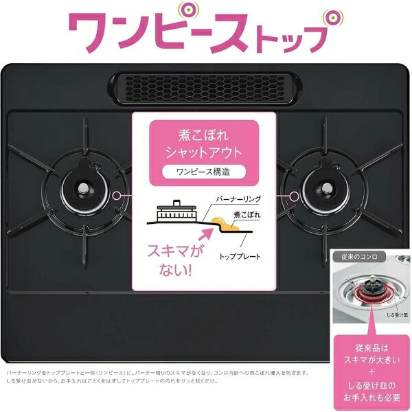 バーナー周りのスキマがなくなり、コンロ内部への煮こぼれ浸入を