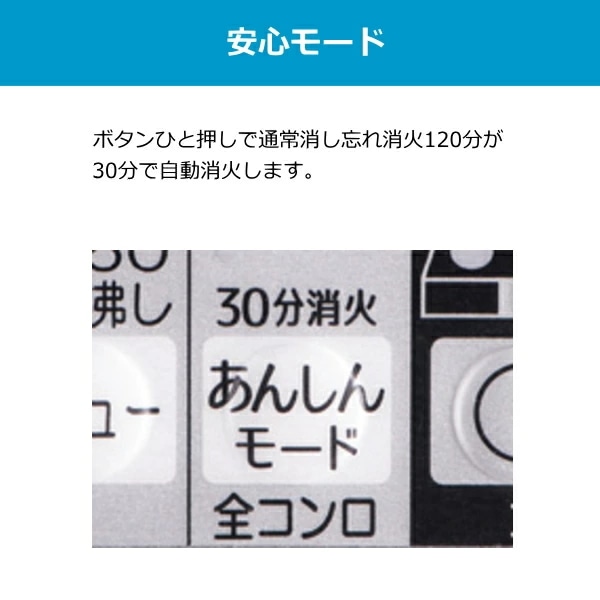 ◎安心モード ボタンひと押しで通常消し忘れ消火120分が30分で自動消火します。