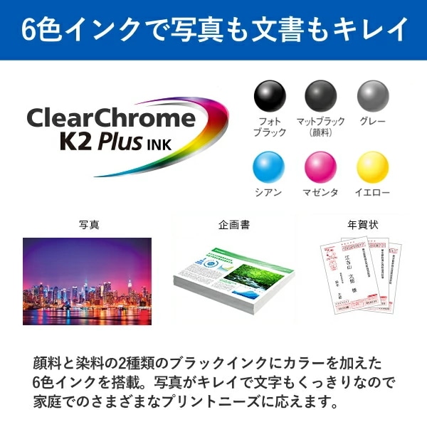 ◎6色インクで写真も文書もキレイ 顔料と染料の2種類のブラックインクにカラーを加えた