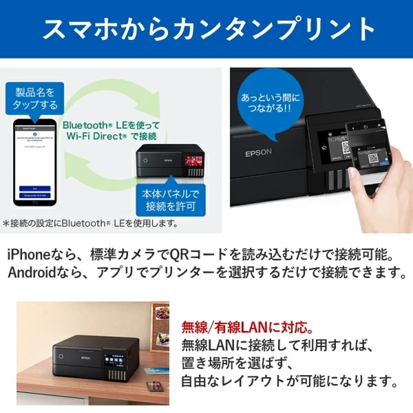 ◎スマホからカンタン・キレイにプリント iPhoneなら、標準カメラでQRコードを読み込むだけで接続可能。