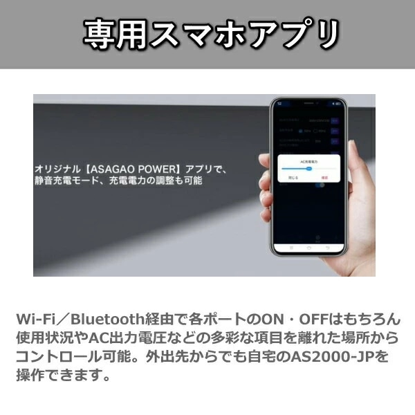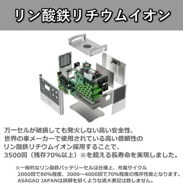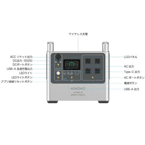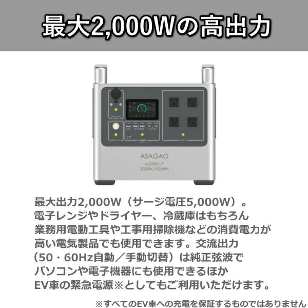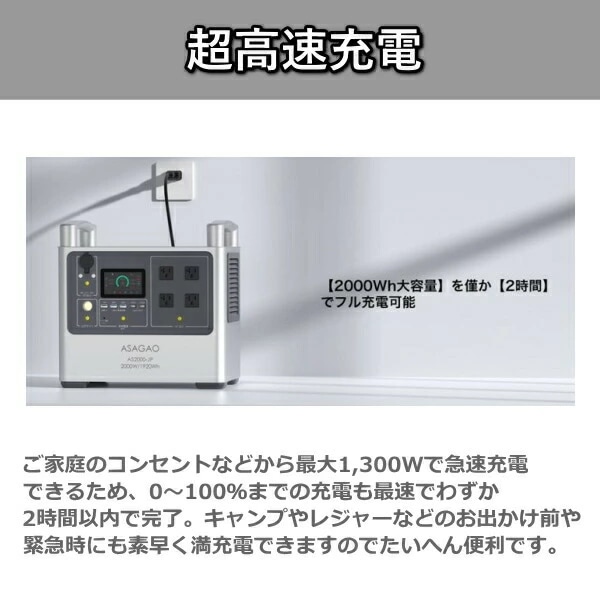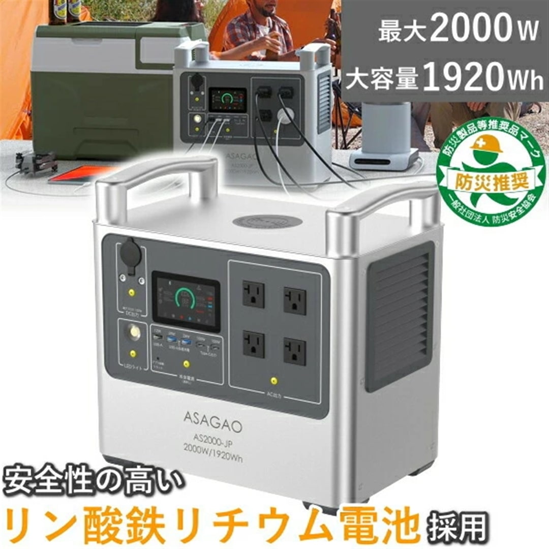 リン酸鉄 リチウムイオンバッテリー AS2000-JP ポータブル電源 定格 2000W 大容量 1920Wh 急速充電 AC出力 DC出力 ポータブルバッテリー 高出力 ASAGAO JAPAN アサガオジャパン アサガオ バッテリー AS2000JP