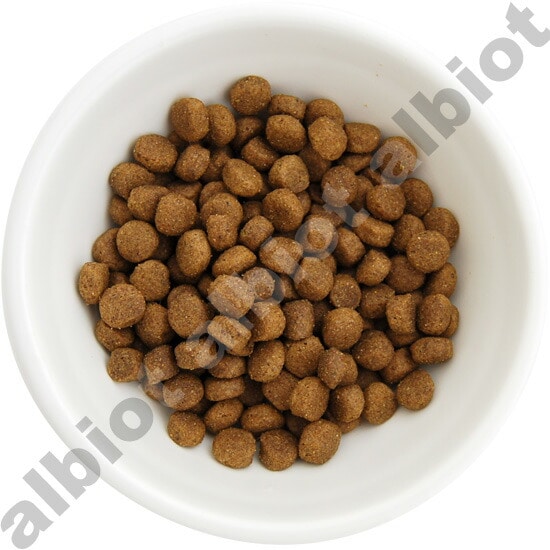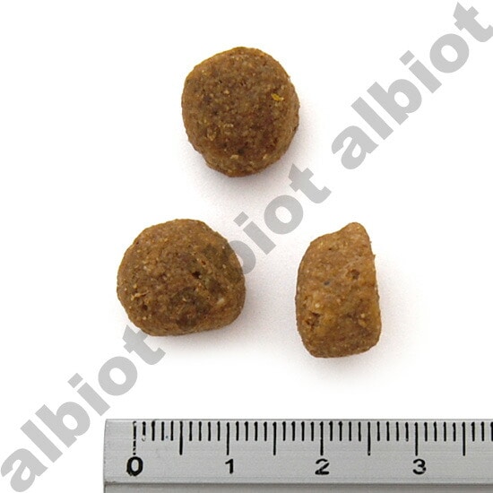 チキンミール、コーン、オート麦、グレインソルガム、乾燥てんさい、鶏肉脂肪、玄米、ニシンミール、乾燥ビール酵母、天然香味料、亜麻仁、海塩、塩化カリウム、炭酸カルシウム、レシチン、L-リジン、DL-メチオニン、乾燥ホエー、塩化コリン、チーズ、乾燥乳酸桿菌発酵産出物、ユッカ・シディジェラ抽出物、ガーリック塩、ビタミンE補助物、天然乾燥海藻、d-カルシウムパントテン酸塩、リボフラビン補助物、ビオチン、ビタミンB12補助物、チアミン硝酸塩、ビタミンA酢酸塩、塩酸ピリドキシン、クエン酸、ビタミンD3補助物、葉酸、硫酸鉄、硫酸亜鉛、タンパク質含有亜鉛、タンパク質含有鉄、硫酸銅、酸化亜鉛、硫酸マンガン、タンパク質含有マンガン、タンパク質含有銅、酸化マンガン、セレン、ヨウ素酸カルシウム
