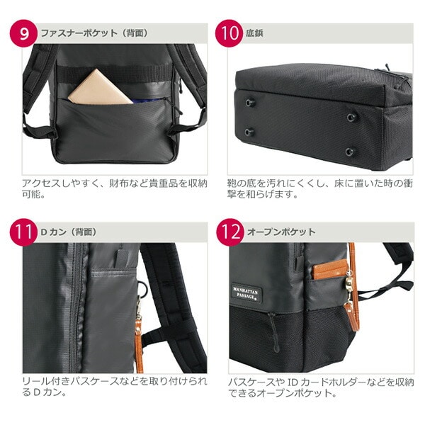 Manhattan Passage マンハッタンパッセージ#3316 “ウェルオーガナイズド” シティバックパック ,プラス2.1男女問わずビジネス、通学、カジュアルのどんな場面でも使える軽くて機能的なA4対応バックパック。シンプルな外観にL字に大きく開くファスナーの中には、機能的な3段ポケット。収納物が鞄の底で乱雑になることなく、すっきりと整理・収納できます。超撥水加工を施してあるので、耐水性、撥水性に非常にすぐれています。さらに、軽量樹脂フレーム内蔵なので、型崩れしにくい仕様です。【A4対応】【13.3インチノートPC対応 最大W33/H23.5/D3cm】 【仕様】 外寸:W28×H38×D14.5cm 重量/容量:695g/13L 素材:特殊コーティングを施した高密度ナイロン