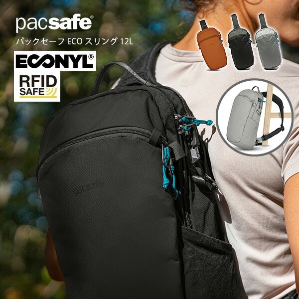 ECO素材で作った盗難防止機能が充実したワンショルダータイプのトラベルバッグ pacsafe Eco 12L Anti-Theft Sling Backpack ECONYL パックセーフ エコ 12L スリング pacsafe パックセーフ ECO 12Lスリング は様々なシーンで活躍するスリングパックです。