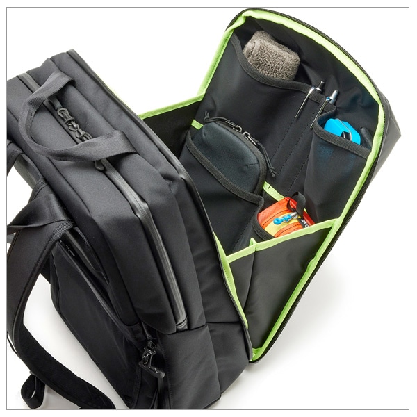 テックコンパートメントは、その名の通りデジタルガジェットを集約して収納するスペースとして約8Lの容量を確保。14インチ相当・12インチ相当のPC(タブレット)がそれぞれ収納できる専用のスリーブポケットに加え、アダプター/マウス/ケーブル類/記憶媒体/充電機器などの周辺機器をまとめて収納するテックポケットを装備。