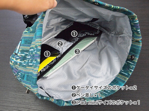 左サイドには携帯電話、その他のアクセサリー用の隠しジッパーポケットを装備。