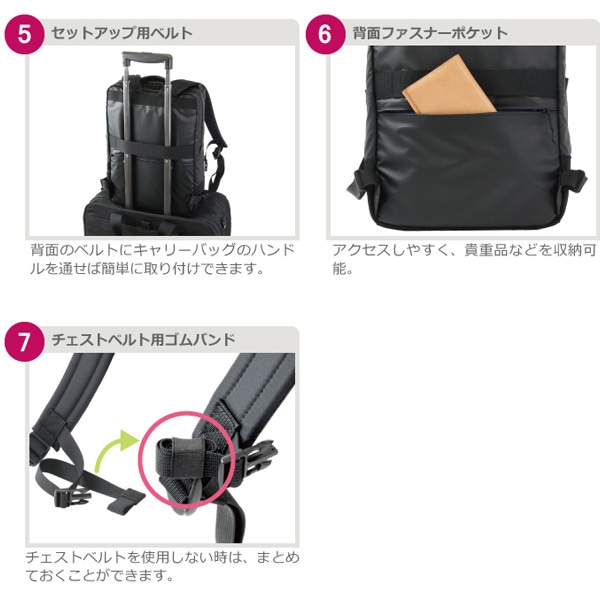 【特徴】 ・強力に水を弾く特殊加工された高密度ナイロンをメイン素材に使用。 ・A4サイズ対応 ・軽量約495g ・背面下側にお財布など貴重品を収納できるシークレットファスナーポケットを装備 ・メインルームおよびフロントルーム内にオープンポケット、PCポケット、ペンホルダーなど数多くのポケット等を装備 ・キャリーバッグのセットアップ用ベルト装備