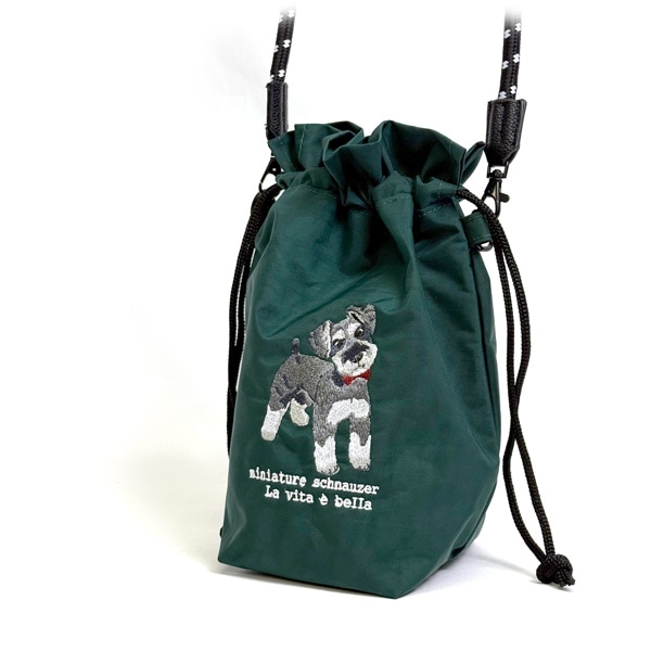 【特徴】 ・可愛い犬の刺繍がポイントのコードショルダー ・高さ約20cm。一般的なハンディファンなどが入るサイズ感 ・ショルダーを外して巾着としてお使用可能 ・内側にオープンポケットを装備