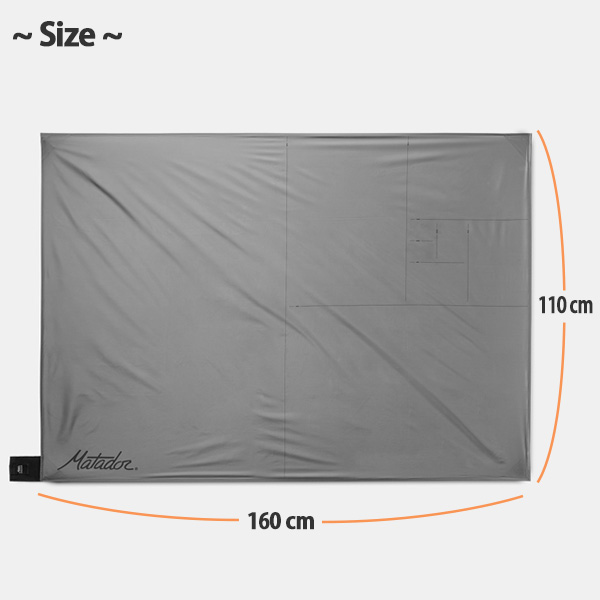 【仕様】 サイズ:160cm×110cm (収納サイズ 11.4cm×6.6cm×2.8cm) ・重量:110g ・メイン素材:防水PUコーティング(PFCフリー)20デニールリップストップ、100デニールブルーサインスパン、70デニールアップサイクルポリエステル、メタル製の地面用ペグ