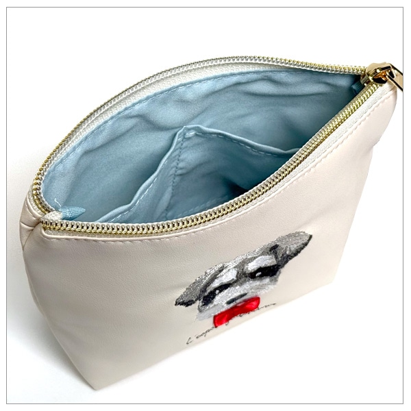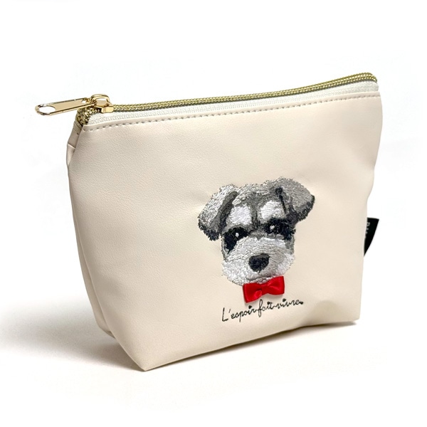 【特徴】・可愛いシュナウザー の刺繍がポイントの合皮製舟形ポーチ・内側にオープンポケットを装備
