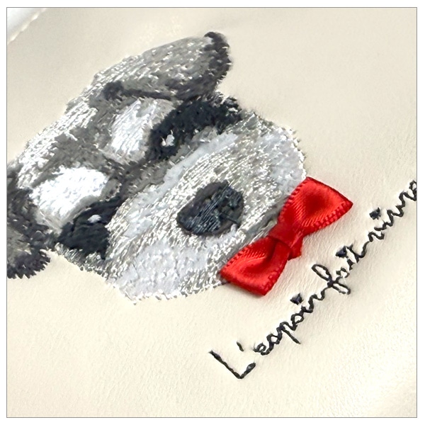 シュナウザー 刺繍のワンポイントに、赤い蝶ネクタイの立体パーツが特徴です。