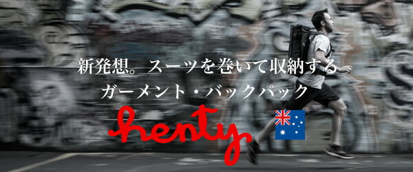 Henty / ヘンティーは、オーストラリアのタスマニア島を拠点としたバッグブランドです。彼の国では、自転車やバイク、ジョギングでの通勤、通学がとても人気でしたが、ビジネスウェアを持ち運ぶ既存のガーメントバッグに不満を持っていた、Jeremy GreyとJon Gourlayの2人は、「スーツを巻いて収納するリュック、メッセンジャーバッグ」というビジネスとスポーツを両立させる独創的なアイディアを生み出しました。スーツを巻いて収納することでシワになりにくく、大きなガーメントバッグも持ち運びのしやすいコンパクトサイズのリュック、メッセンジャーバッグにすることに成功。Henty のガーメントバッグは、ジョギングや自転車、バイクでの通勤や通学のほか、スーツの持ち運びが必要な出張や旅行のシーンでもご利用いただけるスタイリッシュなデザインのガーメントバッグです。