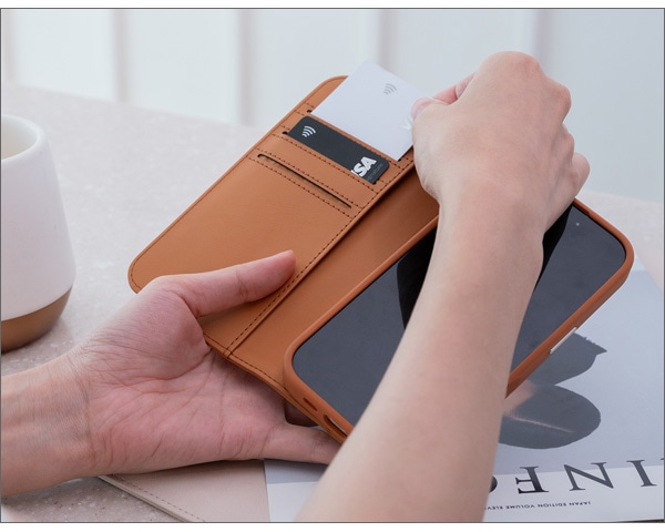 【特徴】・マグネットでスリムケース部が着脱可能な高品質なヴィーガンレザー製ウォレットケース・3つのカードスロットを装備・動画視聴に便利な折りたたみ式スタンドデザイン・プレミアムな合金製のカメラレンズ保護とボタン・スリムケース部は、Qiワイヤレス充電とMagSafeアクセサリに対応・複合素材の衝撃吸収フレームによる落下保護性能・スリムケース部は、moshiの2-in-1リスト/ボディストラップ(別売り)に対応