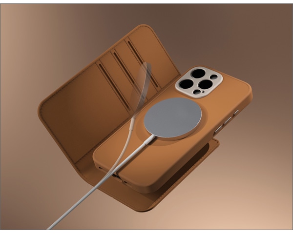 スリムケース部とウォレット部はマグネットで着脱可能。 外せばスリムケース部はワイヤレス充電器やMagSafeアクセサリに対応します。