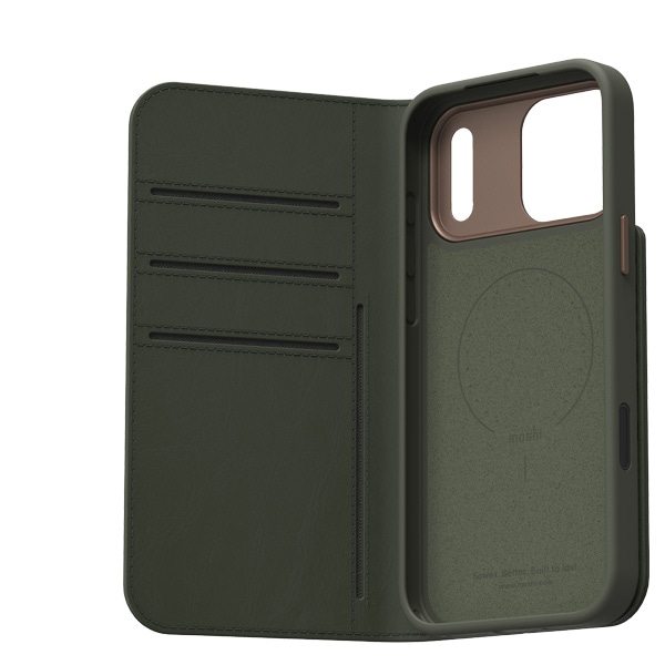 【特徴】・マグネットでスリムケース部が着脱可能な高品質なヴィーガンレザー製ウォレットケース・3つのカードスロットと非接触型カード用のクイックアクセススロットを装備・動画視聴に便利な折りたたみ式スタンドデザイン・プレミアムな合金製のカメラレンズ保護・専用設計のカメラコントロールボタンによりカメラコントロール部も操作性を損なわずカバー・スリムケース部は、Qiワイヤレス充電とMagSafeアクセサリに対応・複合素材の衝撃吸収フレームによる落下保護性能・スリムケース部は、moshiの2-in-1リスト/ボディストラップ(別売り)に対応