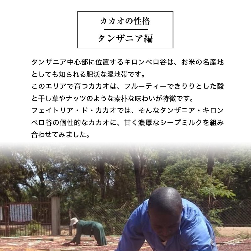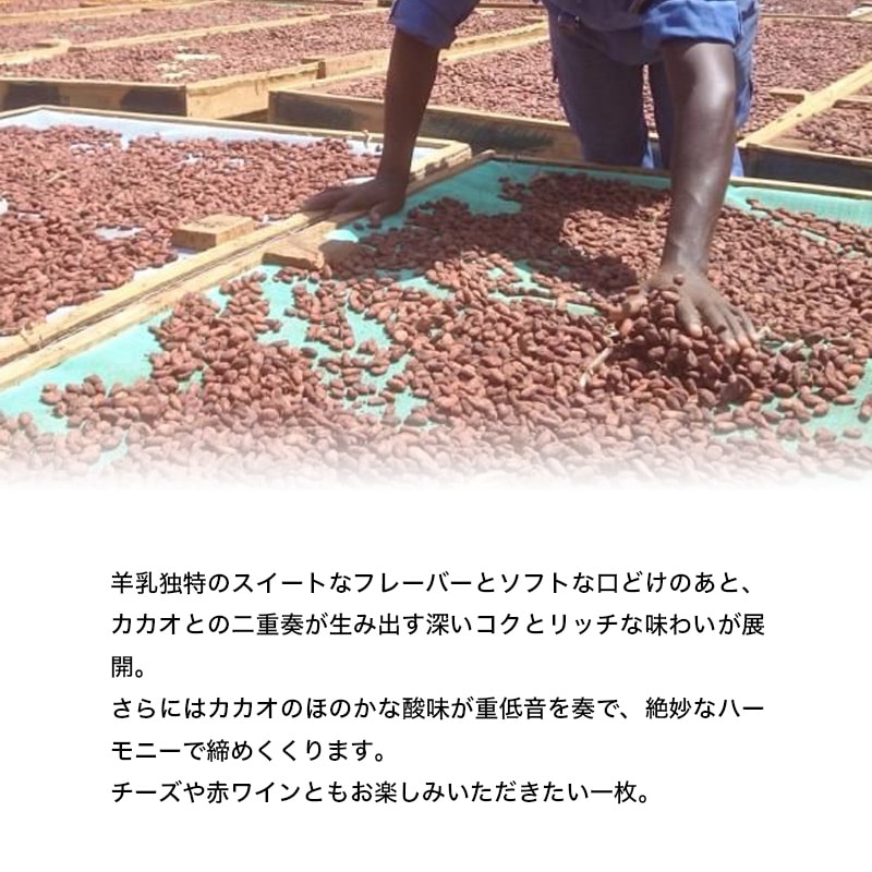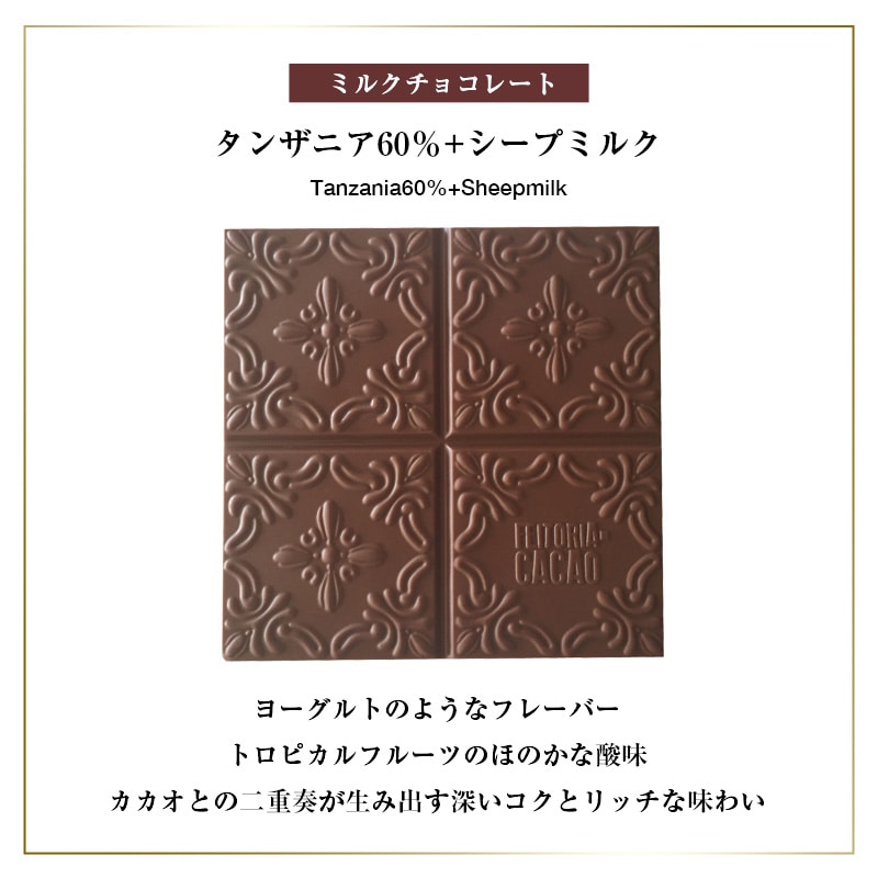 秋冬限定、シープミルクのビーントゥバー。 干し草のように個性的なタンザニア産カカオと、甘いシープミルクのハーモニー ミルクチョコレート タンザニア60%+シープミルク Milk Chocolate Tanzania60%+Sheepmilk ●厳選の天然素材だけを使用した・ビーン・トゥ・バー・数量限定品 ●外箱は紙製パッケージ。中包装は透明ビニール袋。 ●製品はひとつひとつ手作業で仕上げておりますため、形が多少不揃いな場合がございますことをご了承ください。 ●高温多湿を避け、28度以下の常温で保存し、できるだけお早めにお召し上がりください。 ●一度溶けたチョコレートが固まると、油脂分が溶け出し白くなりますが、品質に影響はございません。
