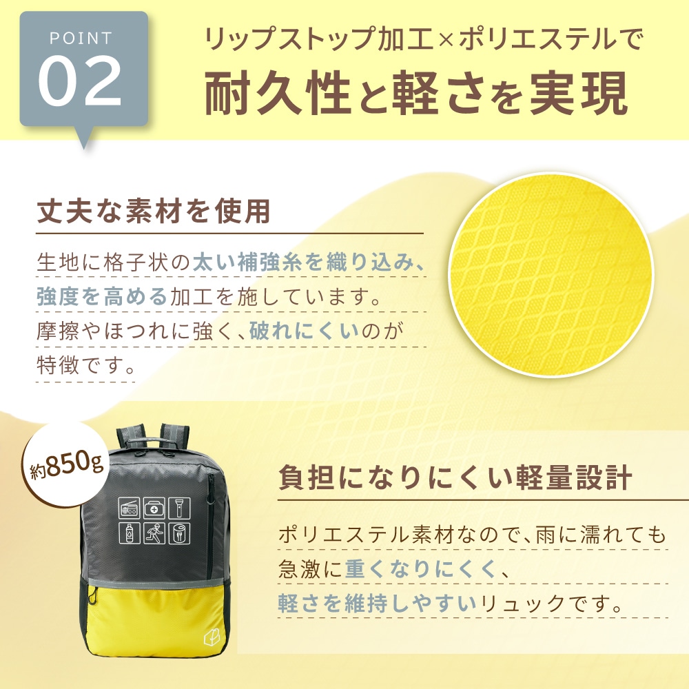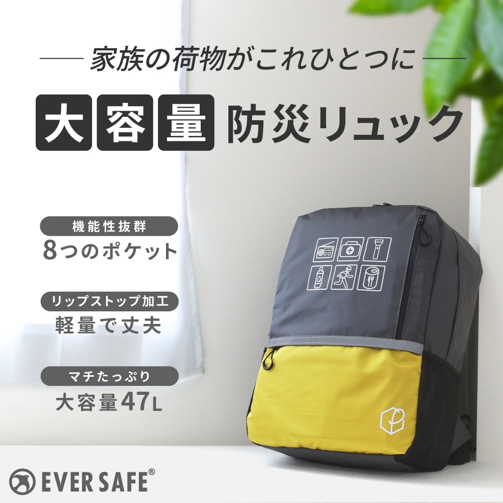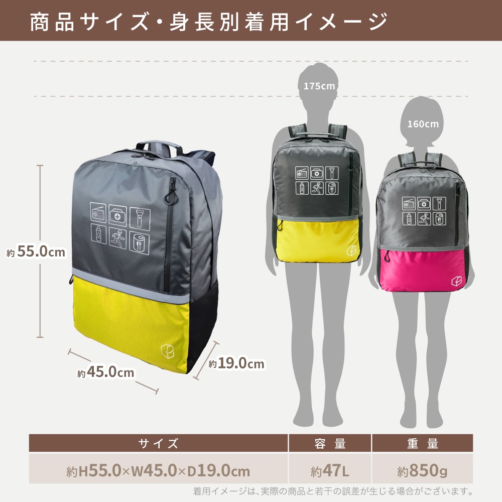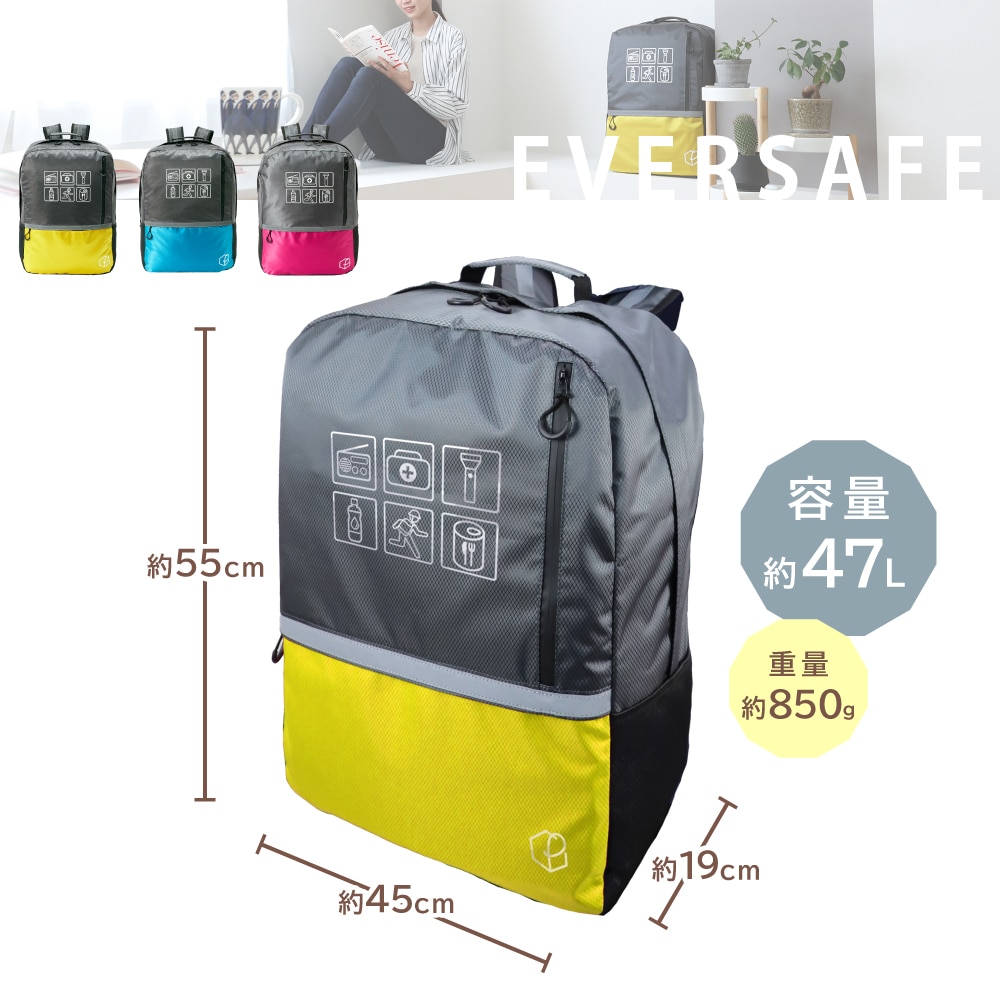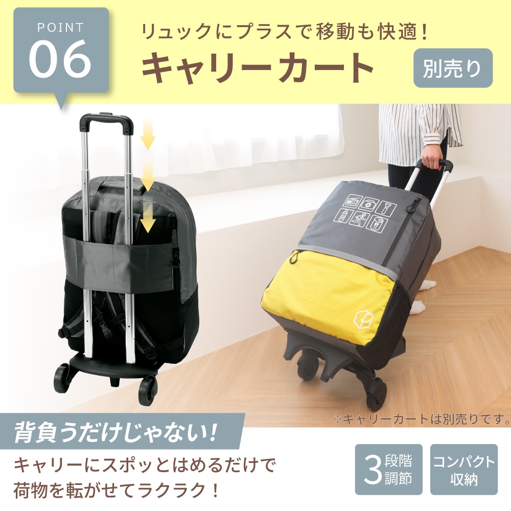 防災リュック大容量47L キャリー対応!軽量で丈夫な防災リュックです。 ■サイズ:(約)横450×縦550×マチ190mm ■カラー:レッド・ブルー・イエロー ■キャリーカート(別売り) 折りたたみ式 固定バンド付き