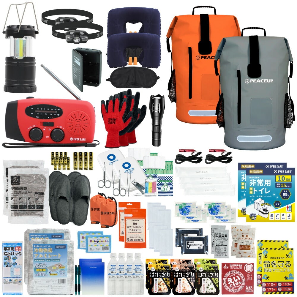 防災セット 2人用 ドライバッグ オレンジ×1・グレー×1 防水リュック ヘッドライト 防災士監修 水害対策 防災リュック 非常食 保存水 防災ラジオ 簡易トイレ 懐中電灯 衛生用品 警戒レベル4 水難 避難 アウトドア L4DR02