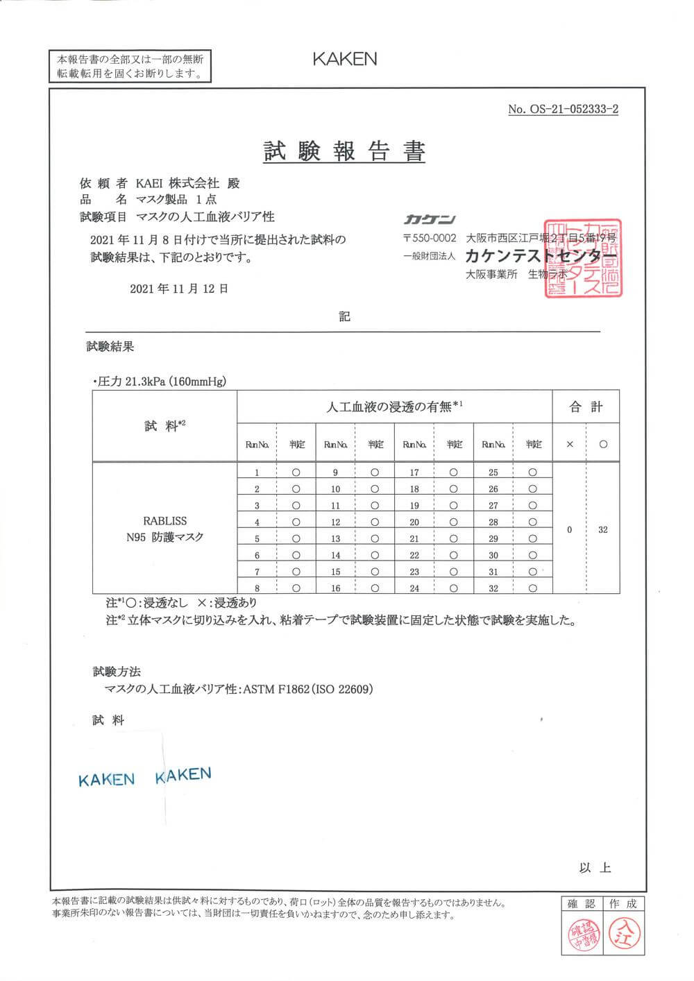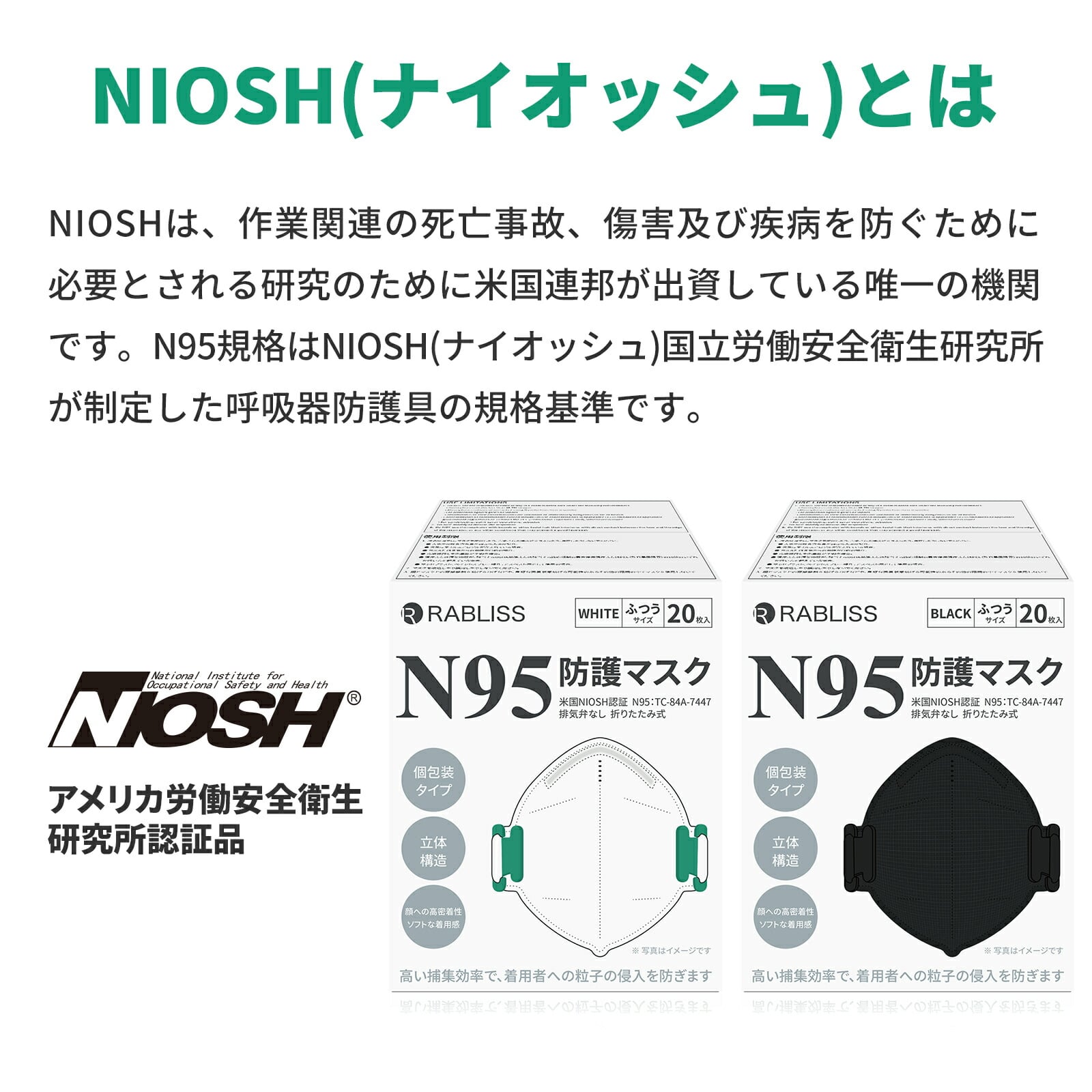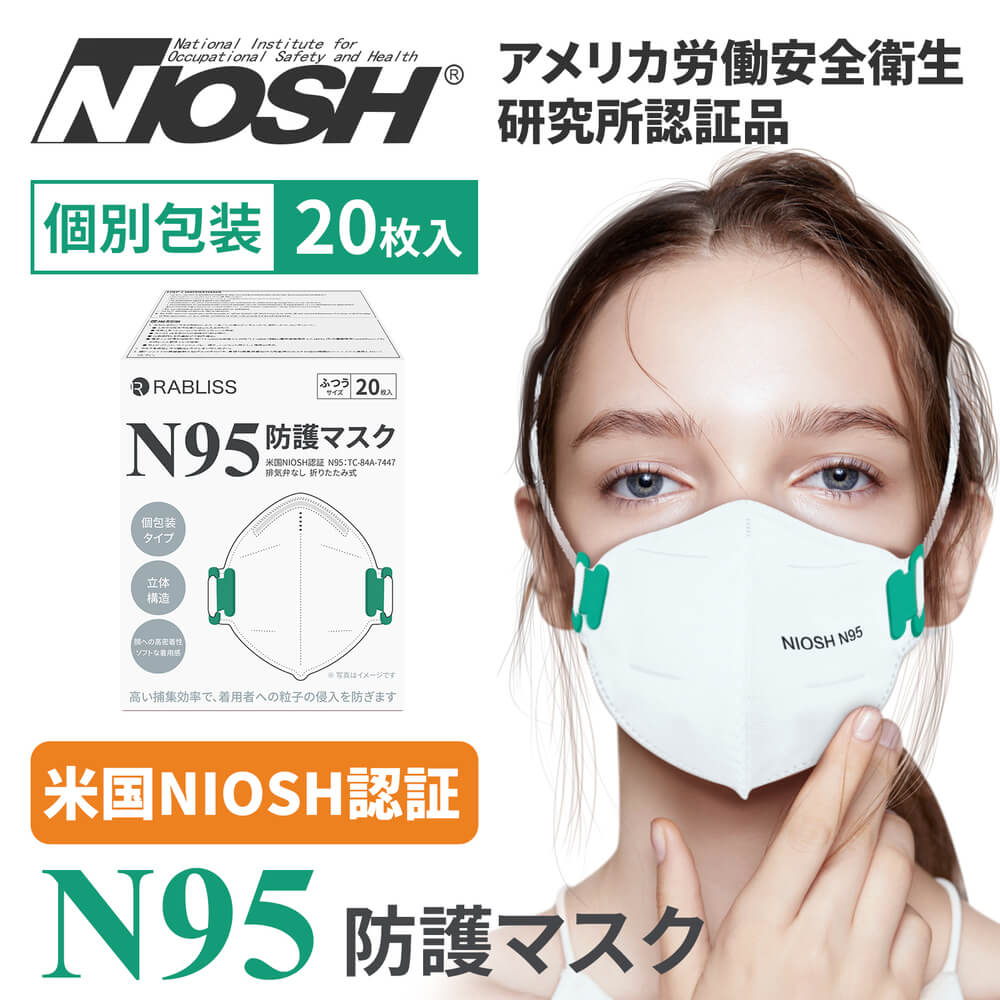 品名:RABLISS マスクN95 型番:KO308 マスクサイズ:115×160mm (±5mm) 入数:1箱あたり個包装 20枚入 色:白/黒 米国労働安全衛生研究所(NIOSH)認証 正規品 米国NIOSH認証 N95マスク:TC-84A-7447 ◆素材 本体・フィルタ部 外層:PPスパンボンド不織布 フィルター層:PPメルトブロー高ろ過不織布 中層:PPニードルパンチ不織布 内層:PPスパンボンド不織布 紐部:ポリウレタン ノーズクランプ部:鉄、ポリプロピレン ※印刷部のデザインは、異なる場合がございます。