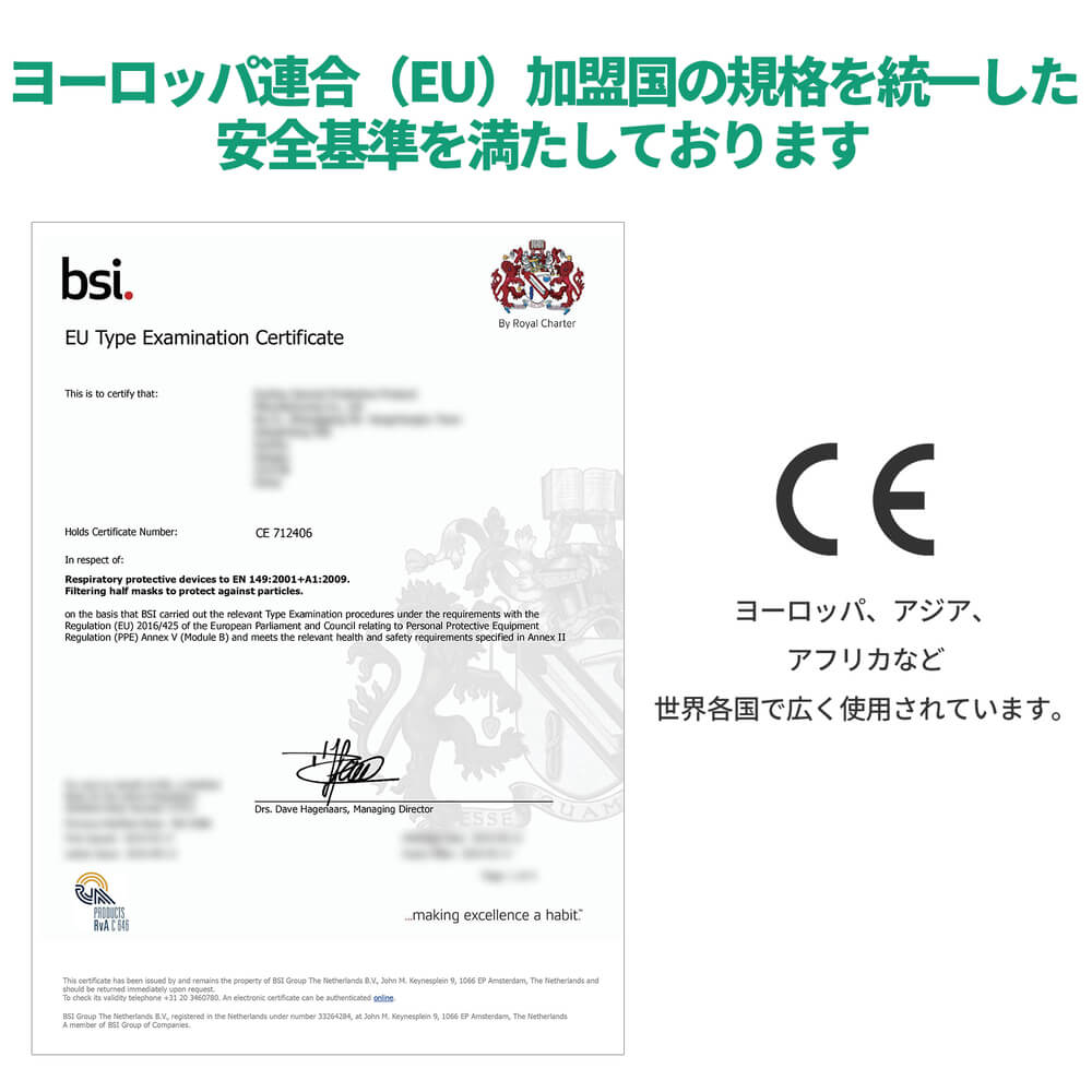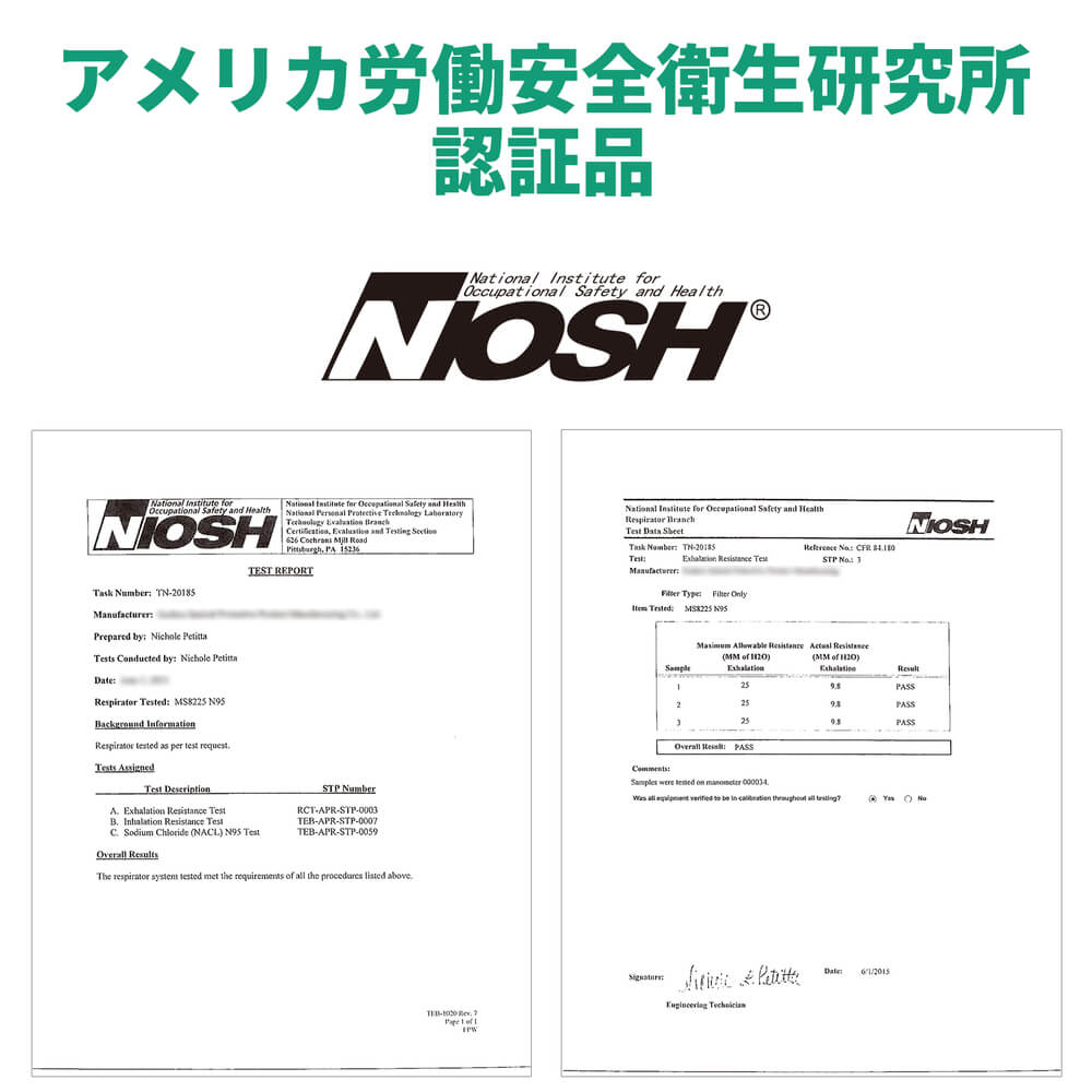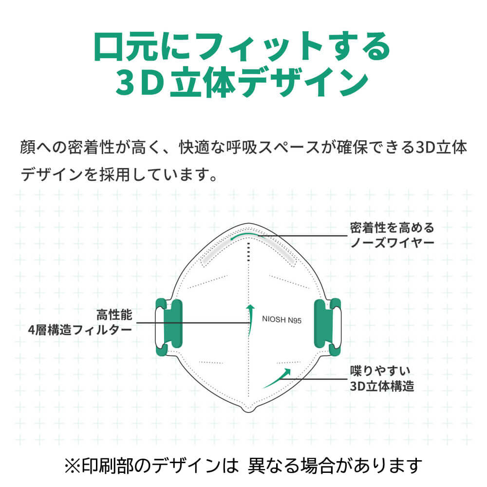 ◆米国NIOSH認証 N95 マスク ●カラー:ホワイト/ブラック ●数量 ・20枚(1箱) ・40枚(20枚入×2箱) ・60枚(20枚入×3箱) ・100枚(20枚入×5箱) ・200枚(20枚入×10箱) ・400枚(20枚入×20箱) ・720枚(20枚入x36箱) /ケース ●4層立体構造 ●高い捕集効率で、着用者への粒子の侵入を防ぎます ●排気弁なし 折りたたみ式 ●顔への高密着性 ソフトな着用感 ●粉塵や灰の侵入を防ぐ防塵マスクとしても使用可能 ◆N95マスク規格とは N95規格とはNIOSH が制定した呼吸器防護具の規格基準であり、N はnot resistant to oil 耐油性なし を表しています。 95とは塩化ナトリウム(空力学的質量径0.3μm)の捕集効率試験で95%以上捕集することを意味しています。 つまりN95マスクは、5μm以下の飛沫核に付着した病原体を捕集することができ、着用者の肺への病原体の進入を防ぐことができるのです。 当店が販売しているN95マスクはNIOSH(米国労働安全衛生研究所)のN95規格をクリアしています ヨーロッパ連合(EU)加盟国の規格を統一した安全基準を満たしております。 米国労働安全衛生研究所(NIOSH)認証 正規品 米国NIOSH認証 N95マスク:TC-84A-7447 米国CDC(米国疾病予防管理センター)の規格をクリア