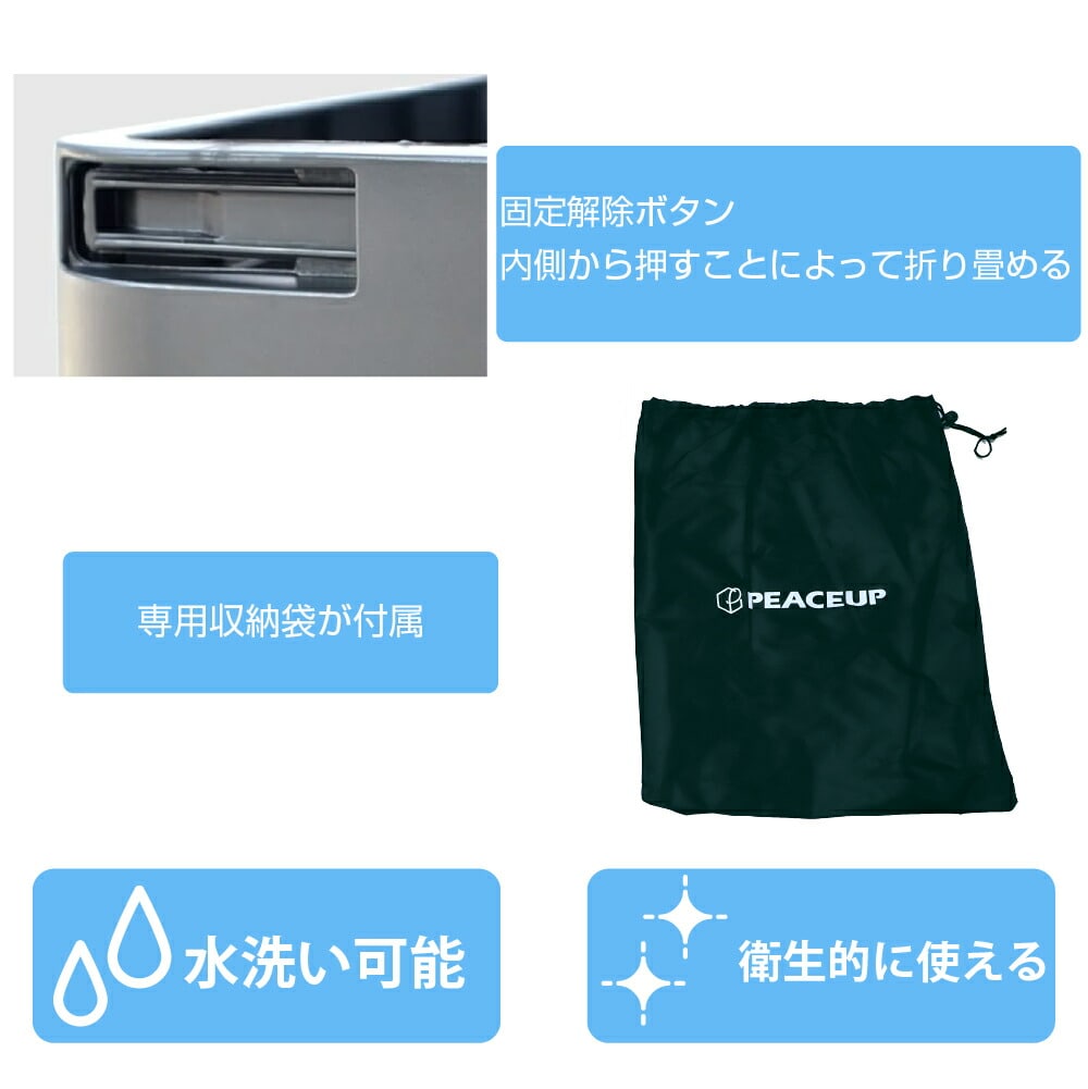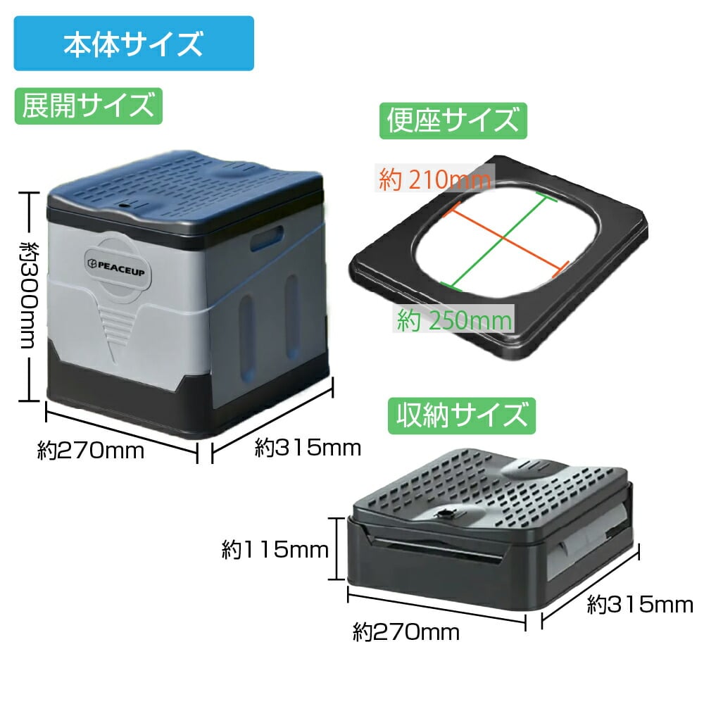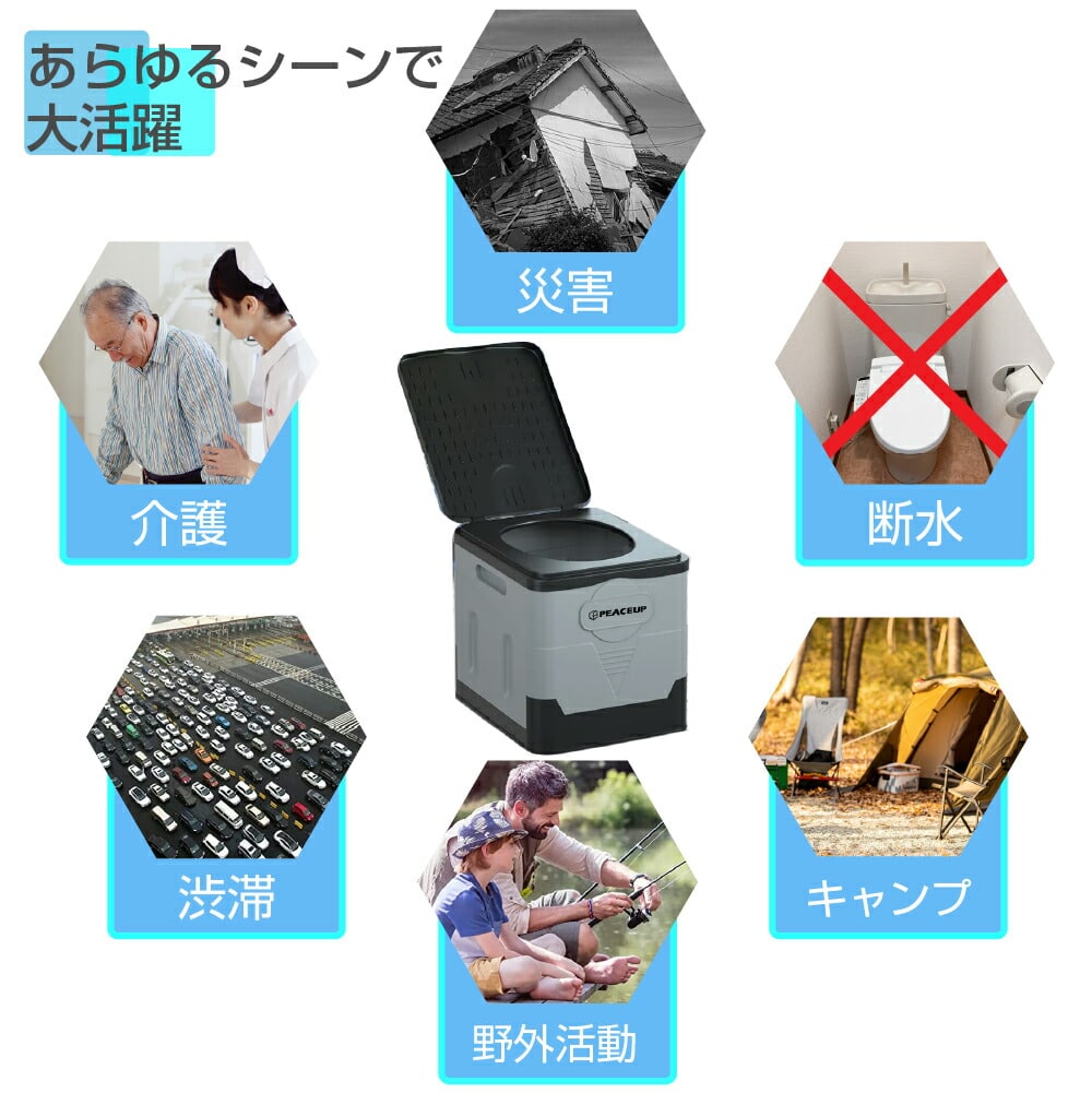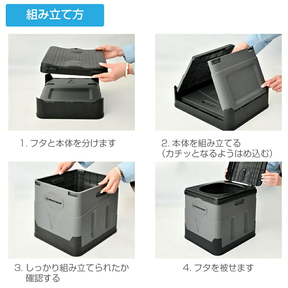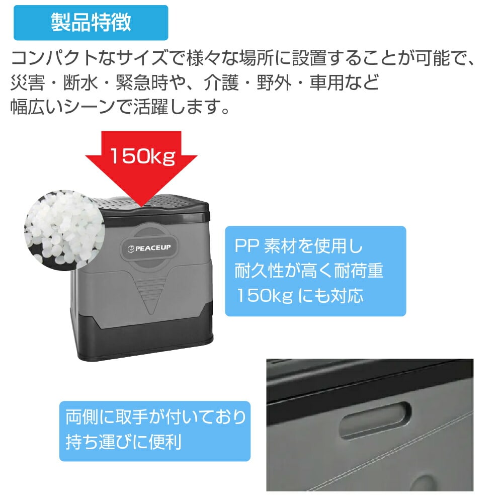 箱型で組み立て式、子どもからお年寄りまで老若男女問わず安心してご利用いただけます。介護用、野外活動、車用などのシーンで大活躍、トイレ以外に収納箱としても使えます。 ・災害時、緊急時に活躍する事が可能で、通常時は椅子、収納箱として使えるマルチBOX型の簡易トイレです。 ・通常時は椅子、収納箱として使用する事が可能で、災害、断水、緊急時はもちろんの事、介護用トイレ、アウトドア時の野外トイレ、渋滞時の車用トイレなど幅広いシーンで活躍します。 ・組み立て式で設置も簡単、収納時に平らになります。コンパクトで持ち運びも簡単で保管時に場所を取りません。付属品の専用収納袋で本体を隠す事もでき、持ち運びや保管場所に困ることはありません。 ・耐荷重は約150kgと耐久性のある丈夫な設計仕様。 ・水洗い可能の素材で、いつでも清潔な状態を保てます。フタ付きのタイプでので臭いや飛沫拡散を防げるので、不衛生にはならず感染リスクを減らすことができます。