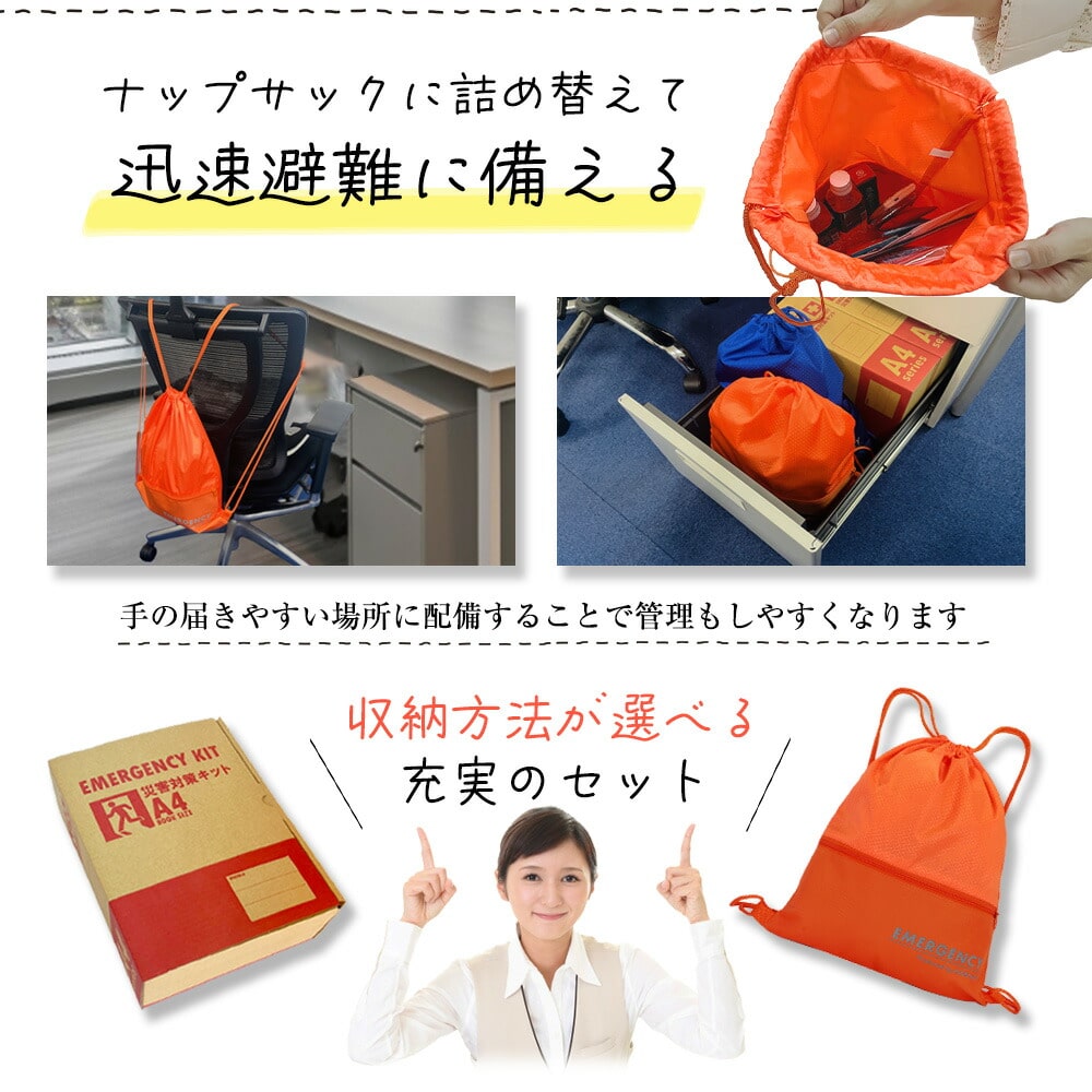充実A4防災セット プラス 1人用 非常用持ち出し袋 防災グッズ ナップサック ブラック コンパクト A4ボックス 非常食 おにぎり 保存水 簡易トイレ オフィス防災 分散備蓄 災害対策 迅速避難 EVERSAFE A4J1