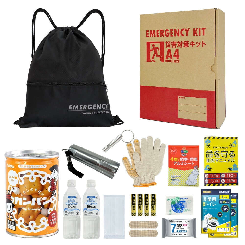 A4防災セット 基本内容ボックス2 非常用持ち出し袋 1人用 防災グッズ ナップサック ブラック コンパクト A4ボックス 非常食 カンパン 保存水 簡易トイレ オフィス防災 分散備蓄 災害対策 迅速避難 EVERSAFE A4k2
