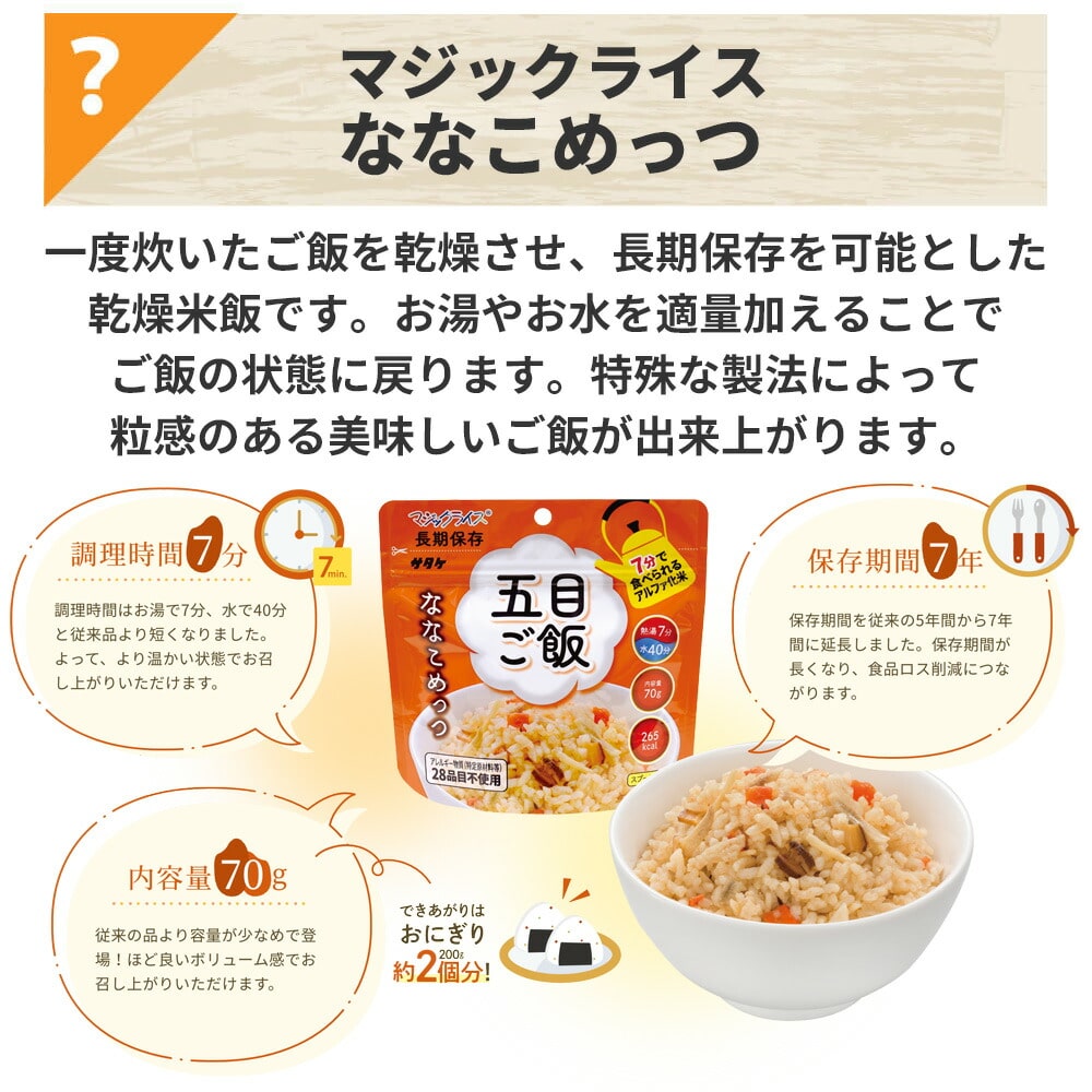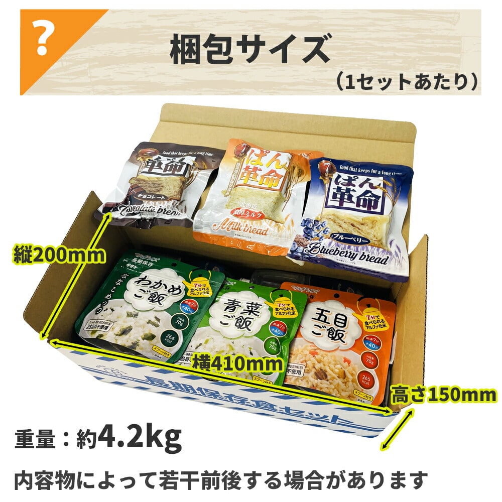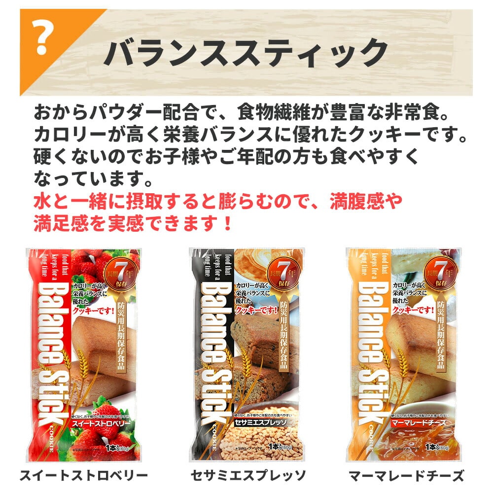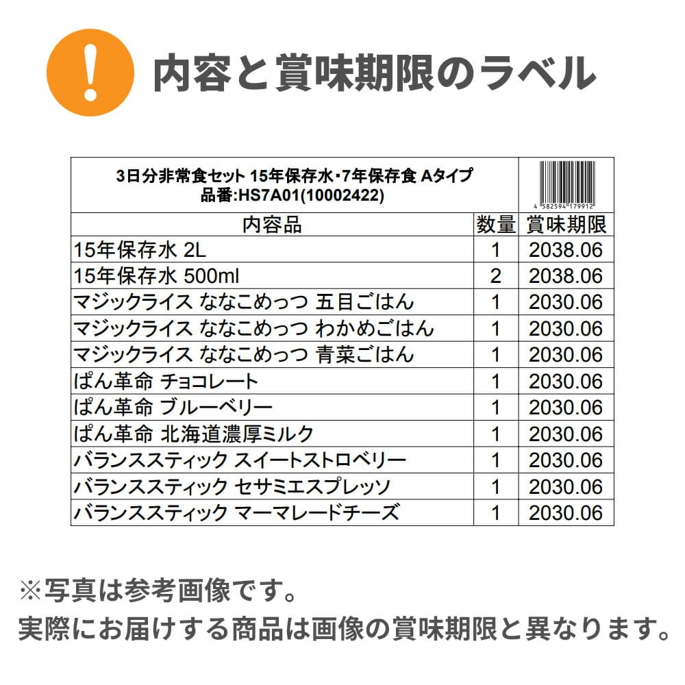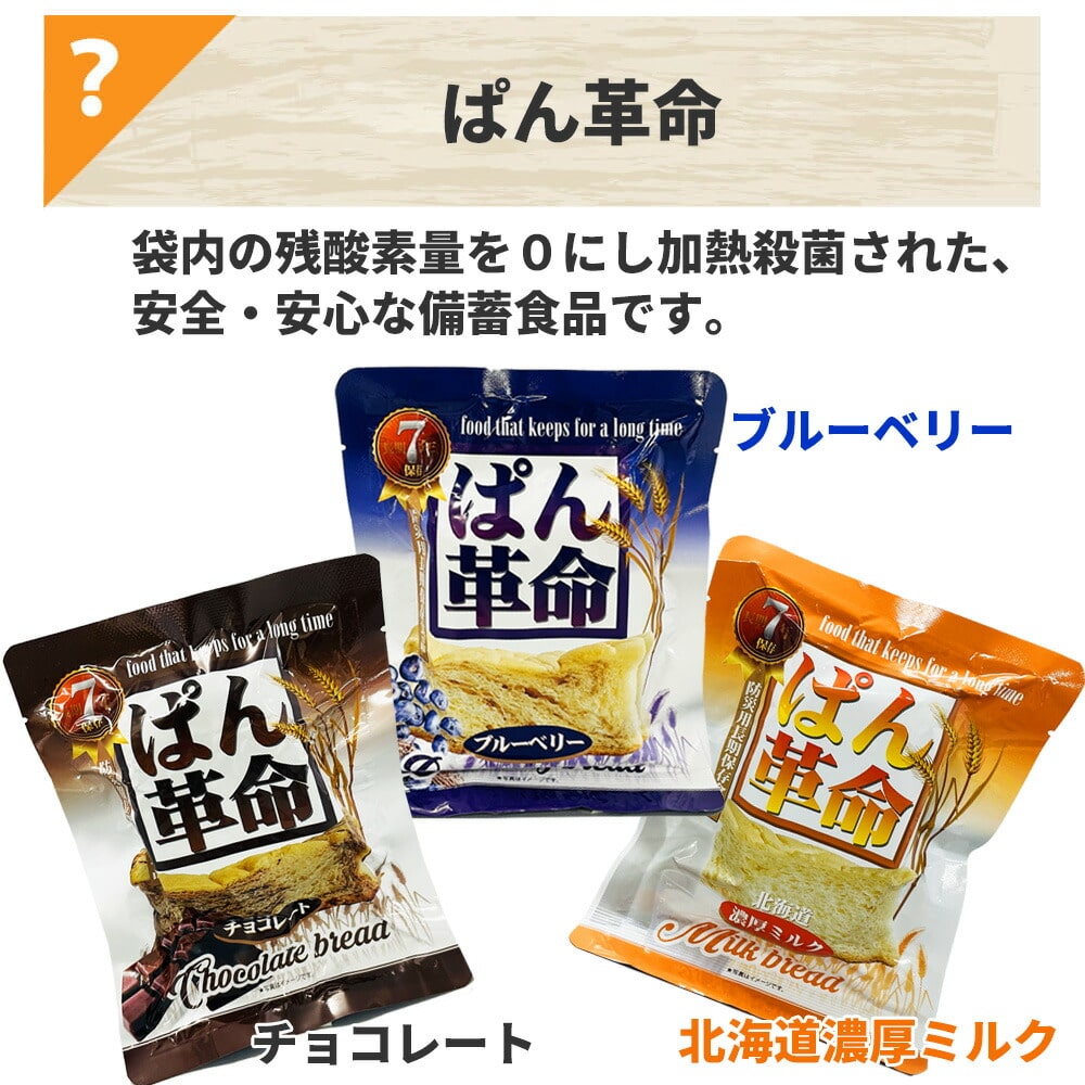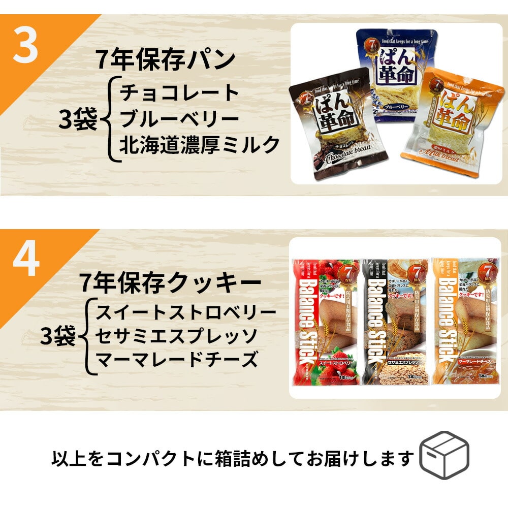 ・15年保存水 カムイワッカ麗水 2L ×1本 ・15年保存水 カムイワッカ麗水 500ml ×2本 ・7年保存 マジックライス ななこめっつ 五目ごはん ×1袋 ・7年保存 マジックライス ななこめっつ わかめごはん ×1袋 ・7年保存 マジックライス ななこめっつ 青菜ごはん ×1袋 ・7年保存 ぱん革命 チョコレート ×1袋 ・7年保存 ぱん革命 ブルーベリー ×1袋 ・7年保存 ぱん革命 北海道濃厚ミルク ×1袋 ・7年保存 バランススティック スイートストロベリー ×1袋 ・7年保存 バランススティック セサミエスプレッソ ×1袋 ・7年保存 バランススティック マーマレードチーズ ×1袋