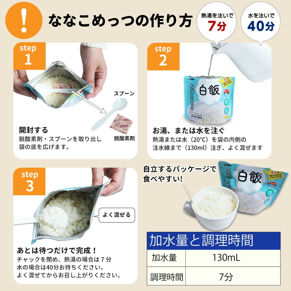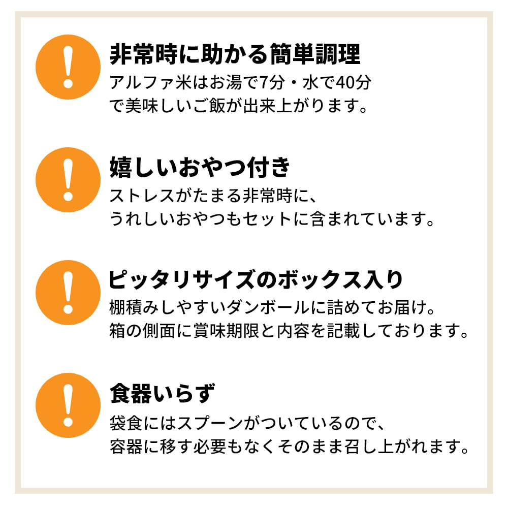 ●袋入保存食は、お湯か水で簡単に作ることができます。 ●袋入パンは、開けるだけですぐに食べられます。 ●保存食は食器不要で、手が汚れていても安心して食べられる工夫がされた商品です。