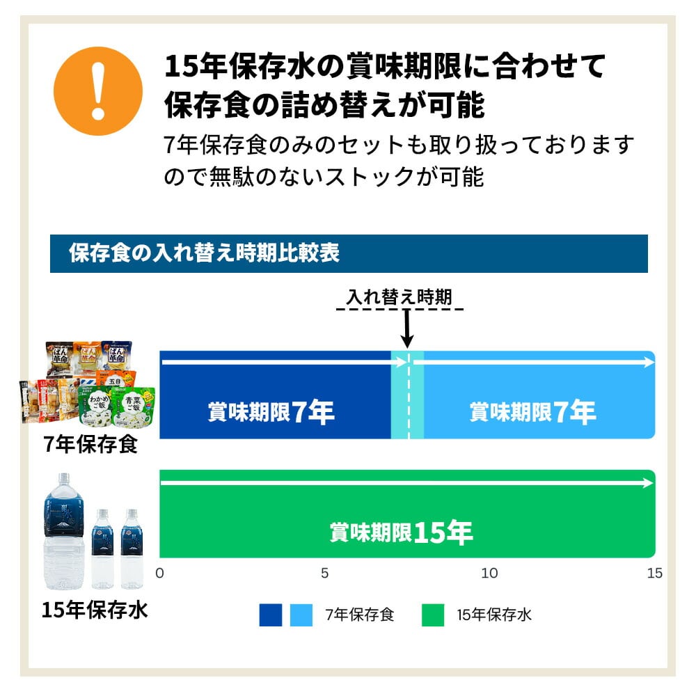 【賞味期限について】 ・保存食 製造より7年保存(賞味期限6年半以上保証) ・保存水 製造より15年保存(賞味期限14年半以上保証)