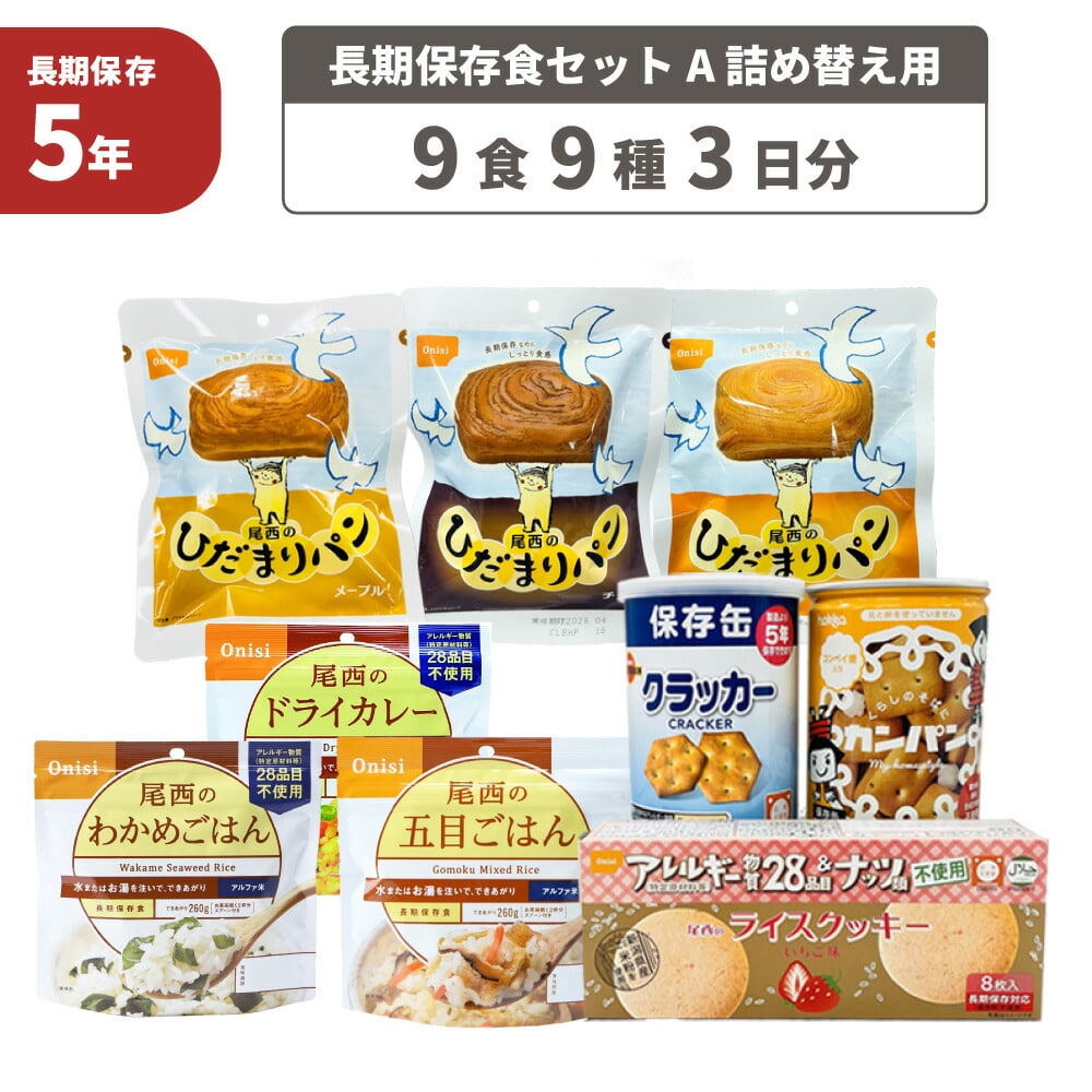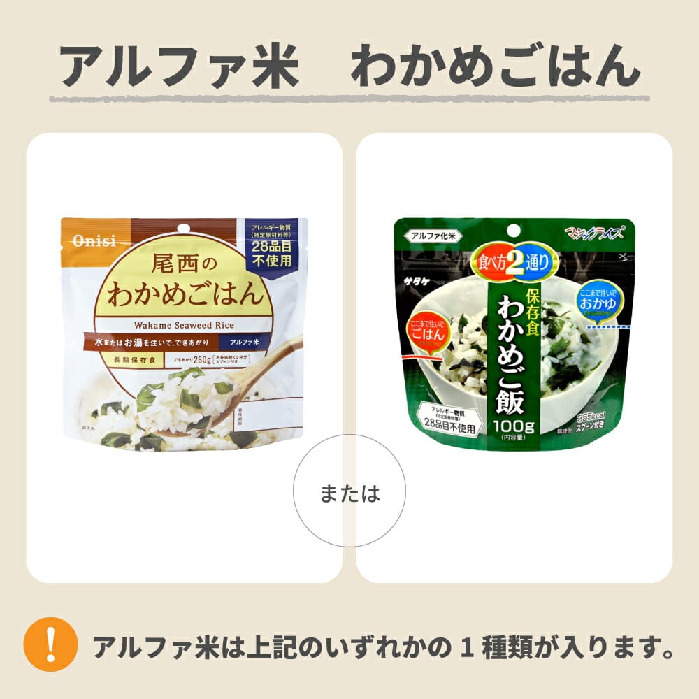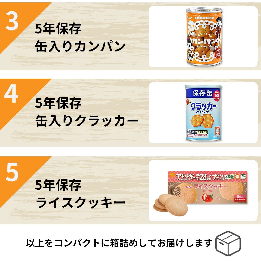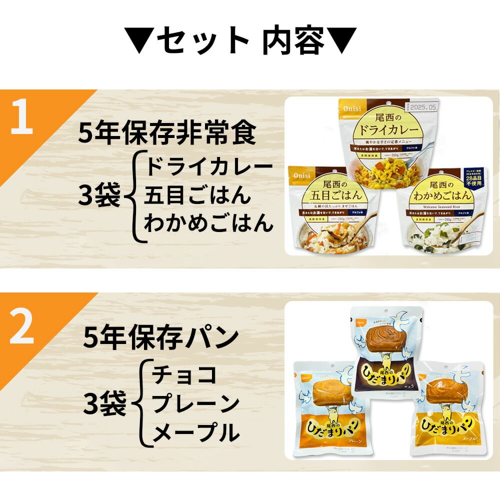 ・5年保存 尾西 アルファ米 ドライカレー ×1袋 ・5年保存 尾西 アルファ米 五目ごはん ×1袋 ・5年保存 尾西 アルファ米 わかめごはん ×1袋 ・5年保存 尾西 ひだまりパン チョコ ×1袋 ・5年保存 尾西 ひだまりパン プレーン ×1袋 ・5年保存 尾西 ひだまりパン メープル ×1袋 ・5年保存 hokka 缶入りカンパン ×1缶 ・5年保存 ブルボン 缶入り ミニクラッカー ×1缶 ・5年保存 尾西 ライスクッキー いちご味 ×1箱