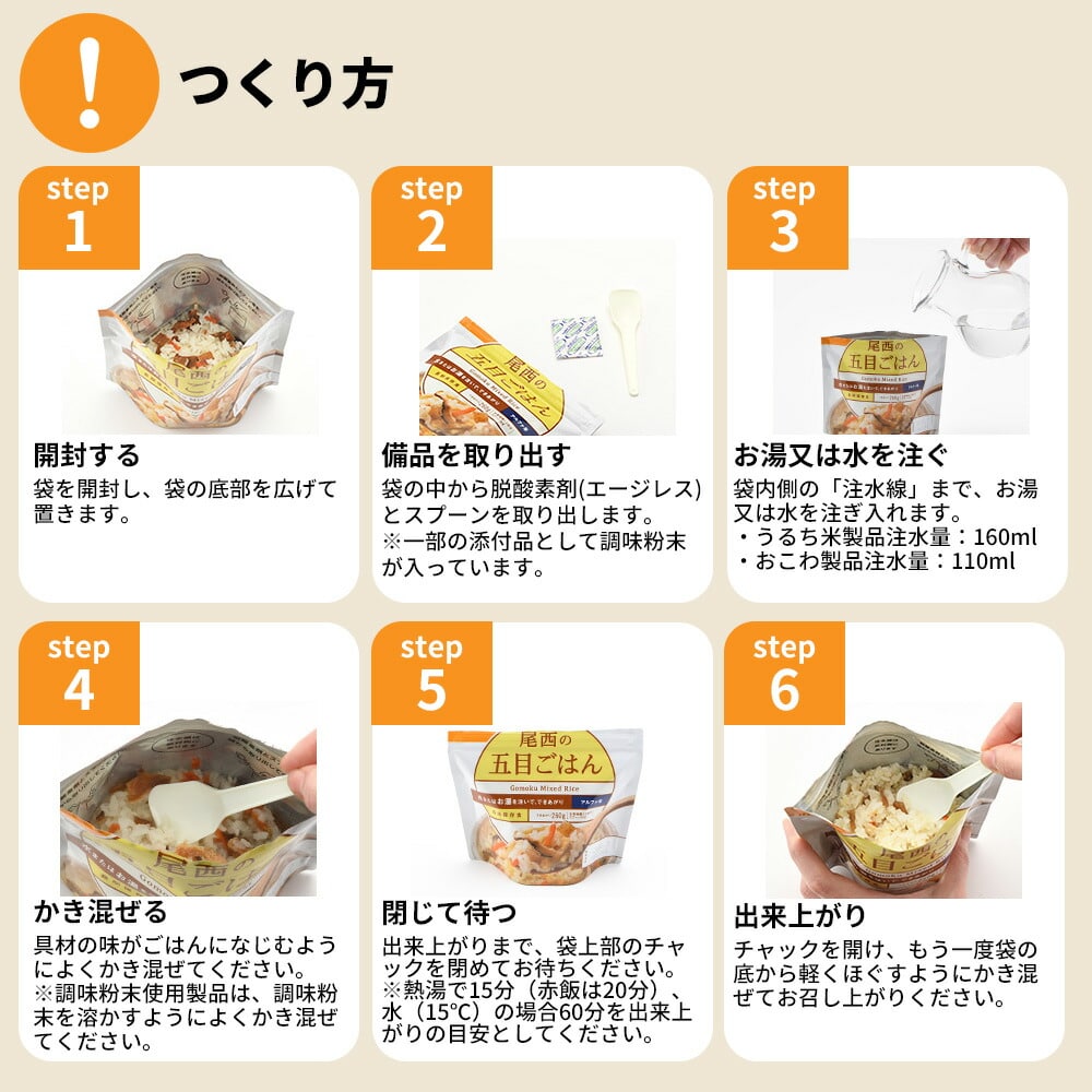 ●袋入保存食は、お湯か水で簡単に作ることができます。 ●袋入パンは、開けるだけですぐに食べられます。 ●保存食は食器不要で、手が汚れていても安心して食べられる工夫がされた商品です。