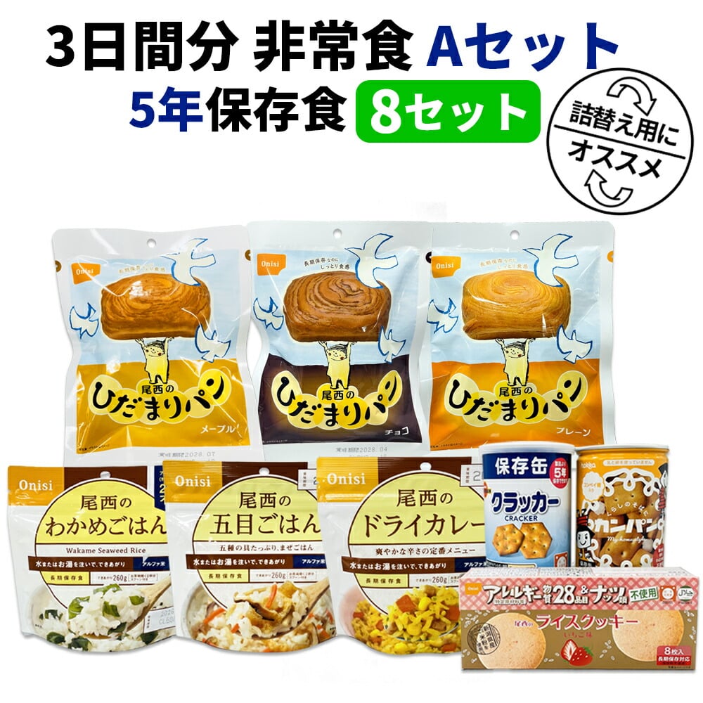 ・5年保存 尾西 アルファ米 ドライカレー ×1袋 ・5年保存 尾西 アルファ米 五目ごはん ×1袋 ・5年保存 尾西 アルファ米 わかめごはん ×1袋 ・5年保存 尾西 ひだまりパン チョコ ×1袋 ・5年保存 尾西 ひだまりパン プレーン ×1袋 ・5年保存 尾西 ひだまりパン メープル ×1袋 ・5年保存 hokka 缶入りカンパン ×1缶 ・5年保存 ブルボン 缶入り ミニクラッカー ×1缶 ・5年保存 尾西 ライスクッキー いちご味 ×1箱