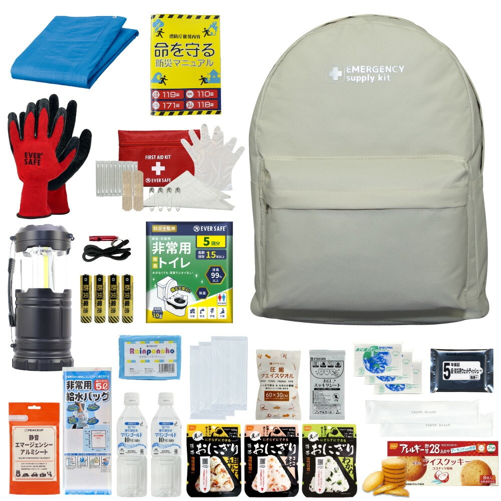 防災セット 1人用 20L エマージェンシーリュック ベージュ おしゃれ 非常用持ち出し袋 防災士監修 防災リュック 非常食 保存水 懐中電灯 簡易トイレ アルミシート 救急セット 警戒レベル3 軽量 コンパクト PEACEUP L3EM01
